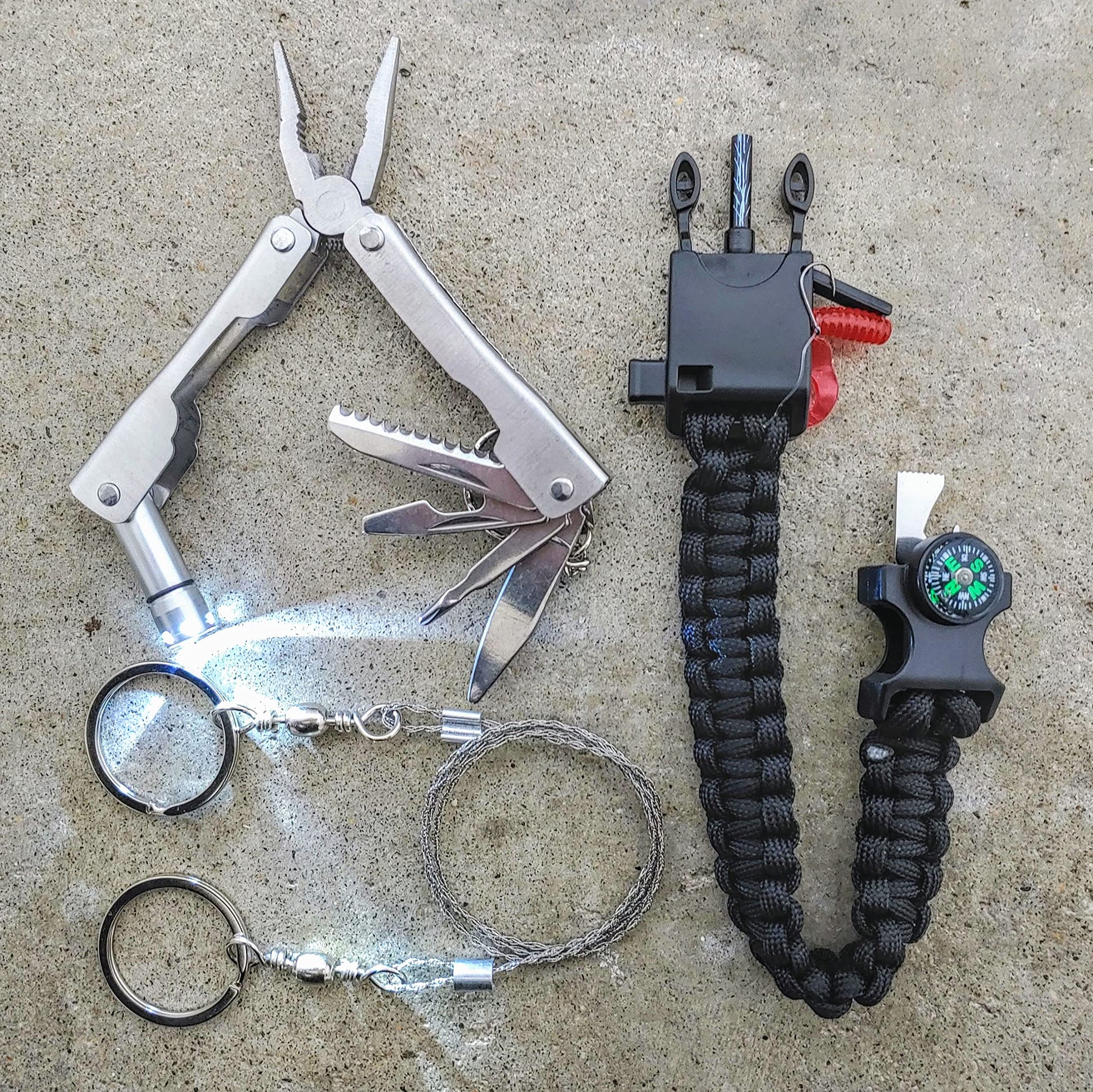 - TACTICAL EMERGENCY SUPPLIES: An emergency blanket, rain poncho, multitool with LED light, wire saw, duct tape, and survival bracelet with flint and compass are crucial in the wilderness (hiking, camping, hunting, or fishing) and on the water.