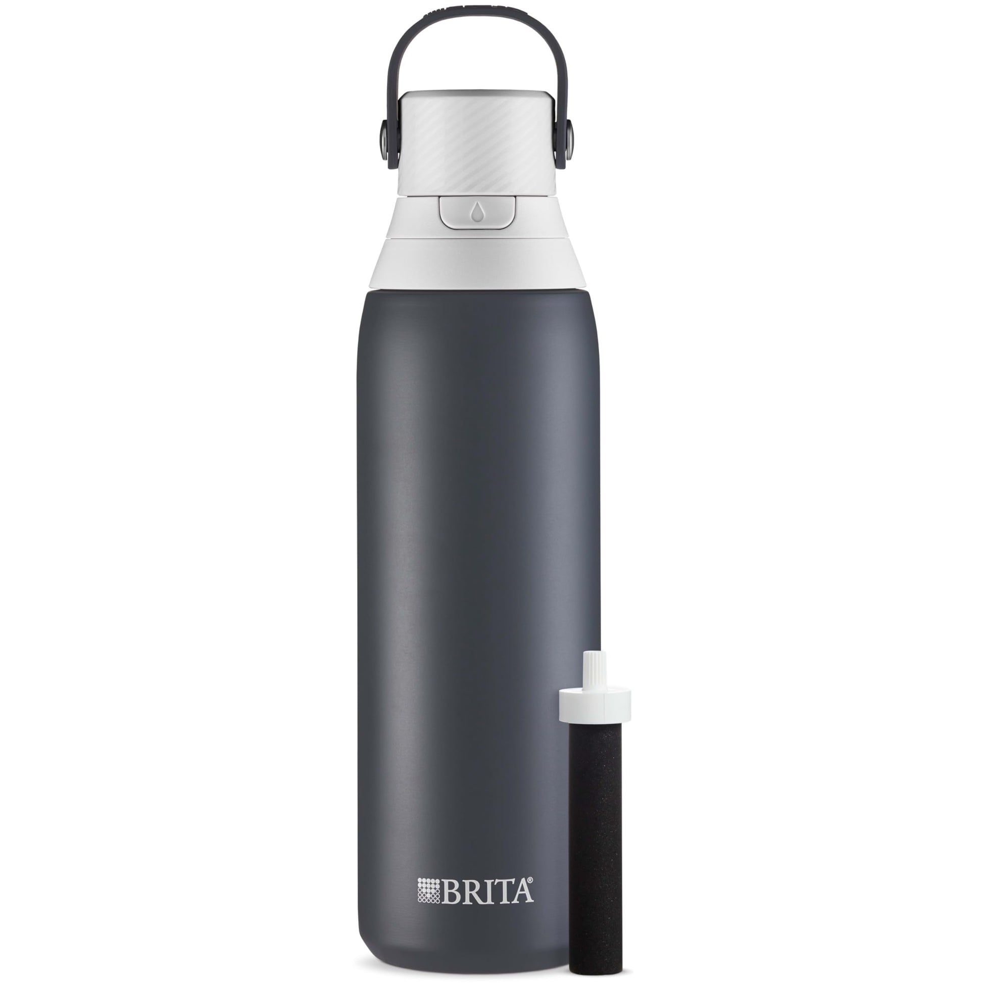 Details: Enjoy great-tasting tap water anywhere with the Brita 20 Ounce Carbon Stainless Steel Premium Filtering Water Bottle. The durable, double wall insulated bottle stays cold for a full 24 hours. It includes 1 replaceable filter, which reduces Chlorine (taste & odor) as you drink. Featuring an enclosed, easy-sip straw, built-in carrying loop for grab-and-go portability, and one-handed push button lid, this bottle is designed for effortless convenience. The bottle is car cup holder friendly and has a leak-proof design to help you avoid surprise drips and spills. Enjoy hassle-free hydration anywhere: at home, the office, a sporting event, or a trip abroad. One bottle filter can replace up to 300 standard 16.9-ounce single-use plastic bottles, so you can stay hydrated, save money, and reduce plastic waste. For best results, replace the filter every 40 gallons or about every two months. With Brita, take filtered water anywhere you go!.