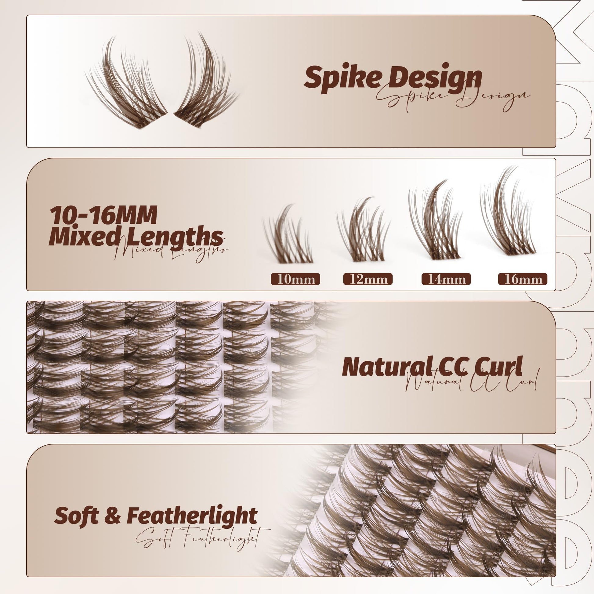 - Stable CC Curl, Ideal for Enhancing Eye Shape: Featuring a natural CC curl design, these brown lash extensions effortlessly enhance your eye shape. Natural lash clusters make your lashes appear fuller and curlier while maintaining a natural charm, giving your eyes a captivating sparkle.