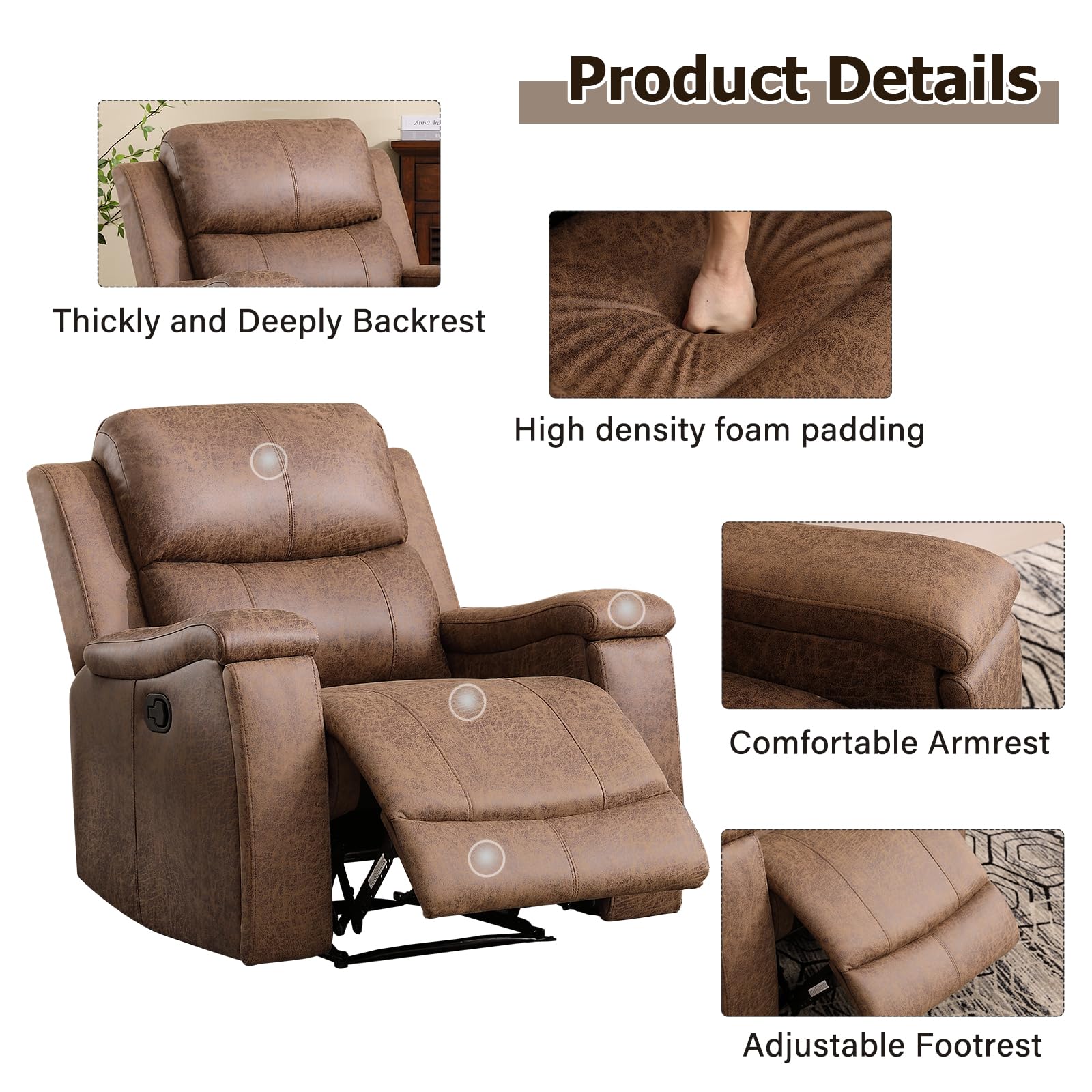 - High Quality: The recliner uses skin-friendly and breathable faux leather to bring a more comfortable touch. There are enough sponges on the recliner to provide you with enough back and lumbar support. The interior of the recliner is a very strong wooden structure, a durable metal frame is used at the bottom to ensure the safety of the user and prolong the service life.