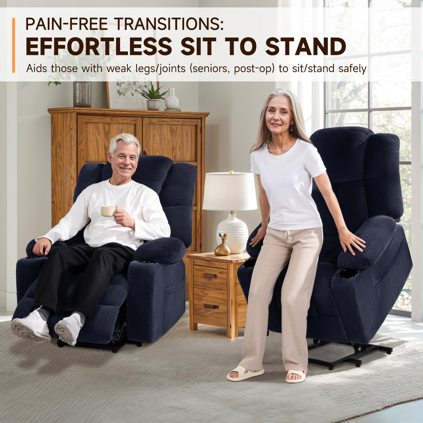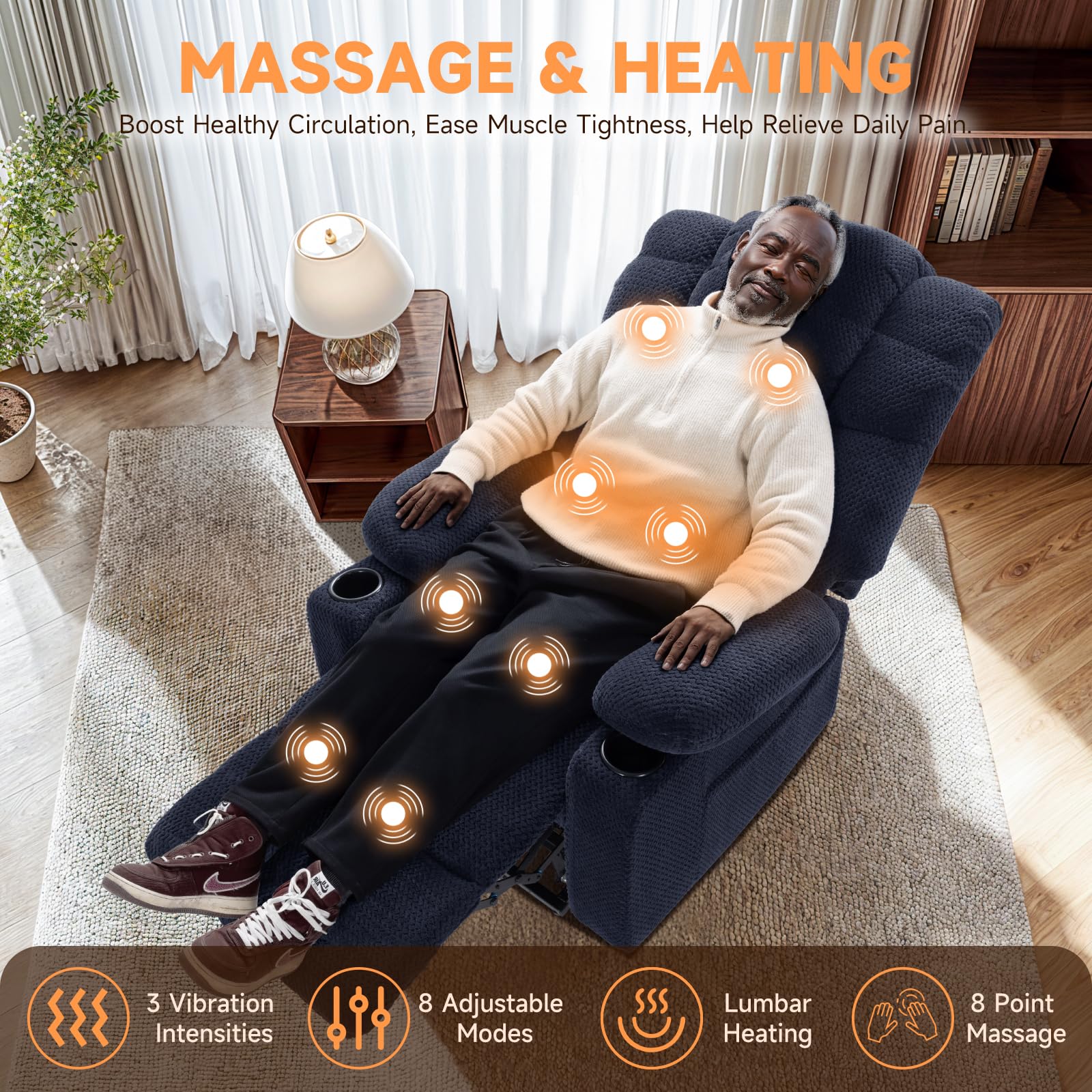 CFVYNE Power Lift Recliner Chair for Elderly with Massage and Heated, 3-Position, 2 Cup Holder, USB-A & USB-C, Soft Plush Fabric, Side Pocket Navy Blue