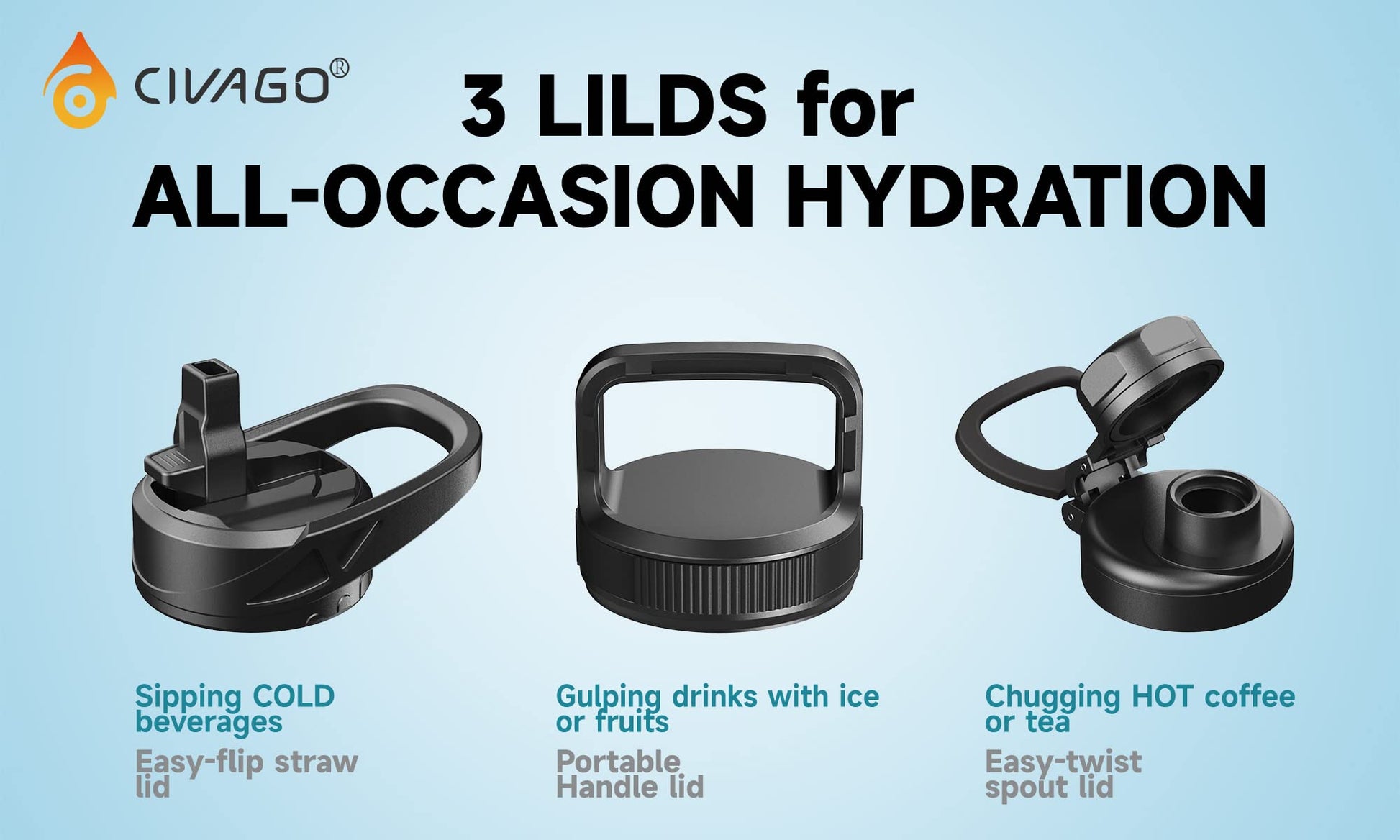- WATER BOTTLE WITH STRAW AND LEAKPROOF LIDS: Our sports water bottle is equipped with 3 lids: 1 flip-up straw lid, 1 easy-twist spout lid and 1 portable handle lid. All caps allow for easy one-handed or hands-free sipping when you are busy or on-the-go