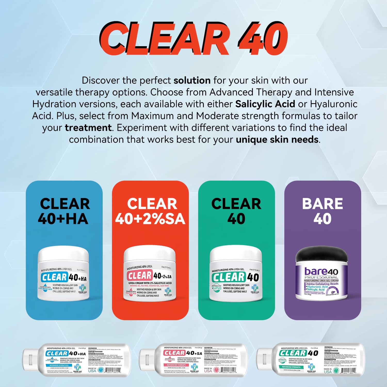 • π„π—π…πŽπ‹πˆπ€π“πˆπŽπ 𝐀𝐍𝐃 π‡π˜πƒπ‘π€π“πˆπŽπ π–πˆπ“π‡ π’π€π‹πˆπ‚π˜π‹πˆπ‚ π€π‚πˆπƒ - CLEAR Urea Cream combines 40% Urea with 2% Salicylic Acid to intensely hydrate and exfoliate your skin, removing dead skin cells and allowing deeper moisture penetration. Foot cream with urea and salicylic acid perfect for treating stubborn calluses, cracked heels, and dry skin on hands, feet, and elbows