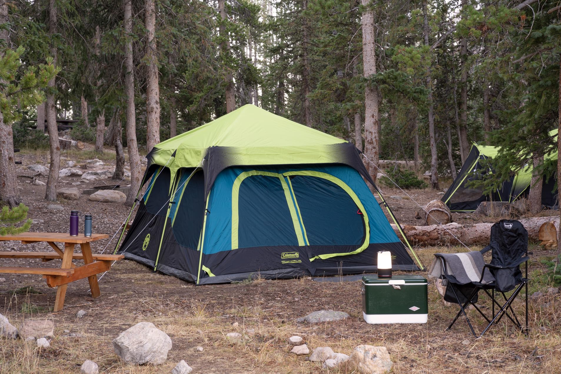 Details: Turn your camping into glamping with the Coleman Camping Tent. Equipped with Dark Room Technology, it reduces inside heat, providing a comfortable rest at any time of day. This WeatherTec system's tent is perfect for backyard family gatherings, festivals, or trips to the beach. Its welded corners and inverted seams keep water at bay. With an included rainfly for extra weather protection, reflective guy lines for greater visibility at night, and an E-Port for easy electrical power access, this tent has everything you need. The room divider provides added privacy, and the quick setup can be completed in as fast as 1 minute.