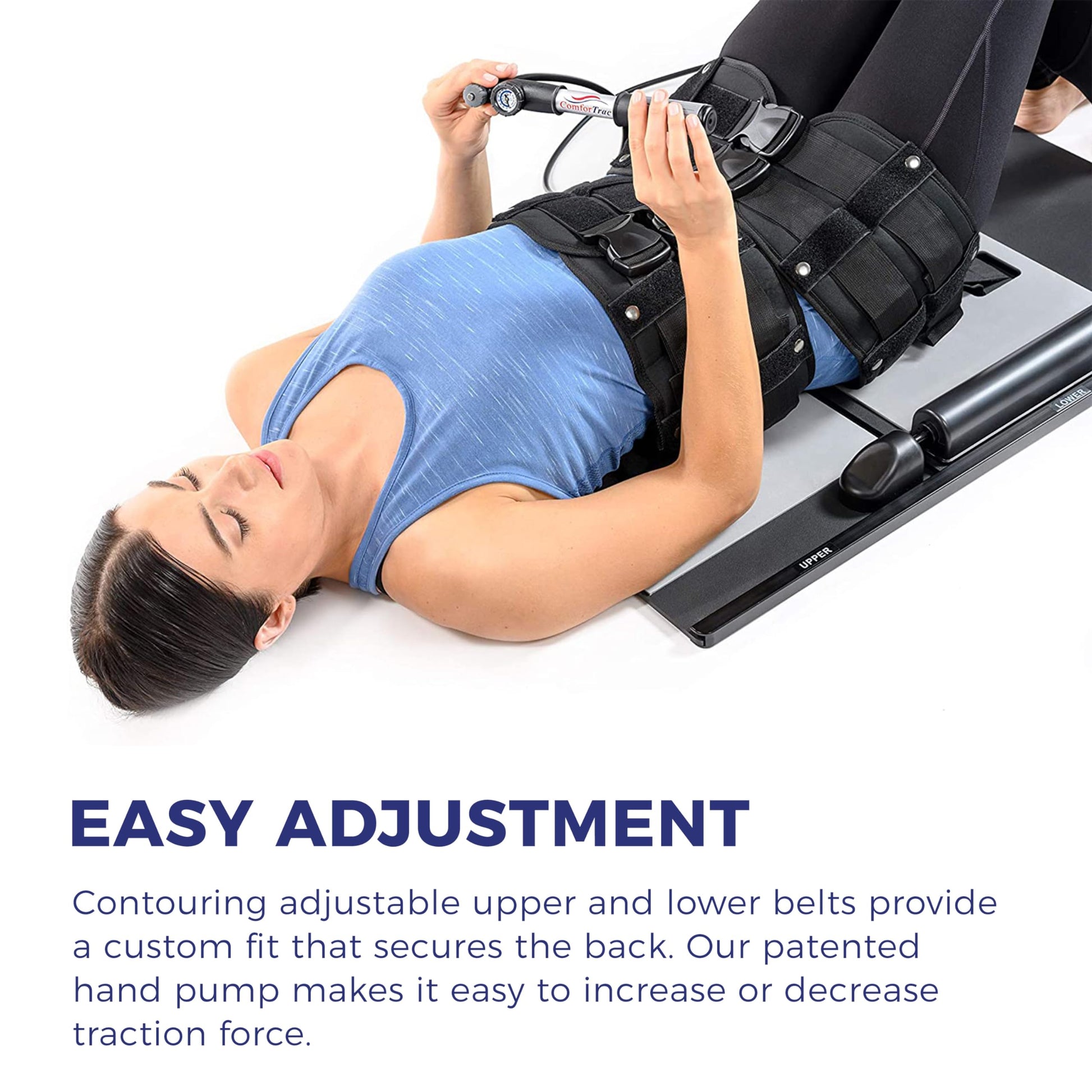 - EASY TO ADJUST. This patented product comes with contouring adjustable upper and lower belts for a custom fit that secures the back while providing lumbar traction.