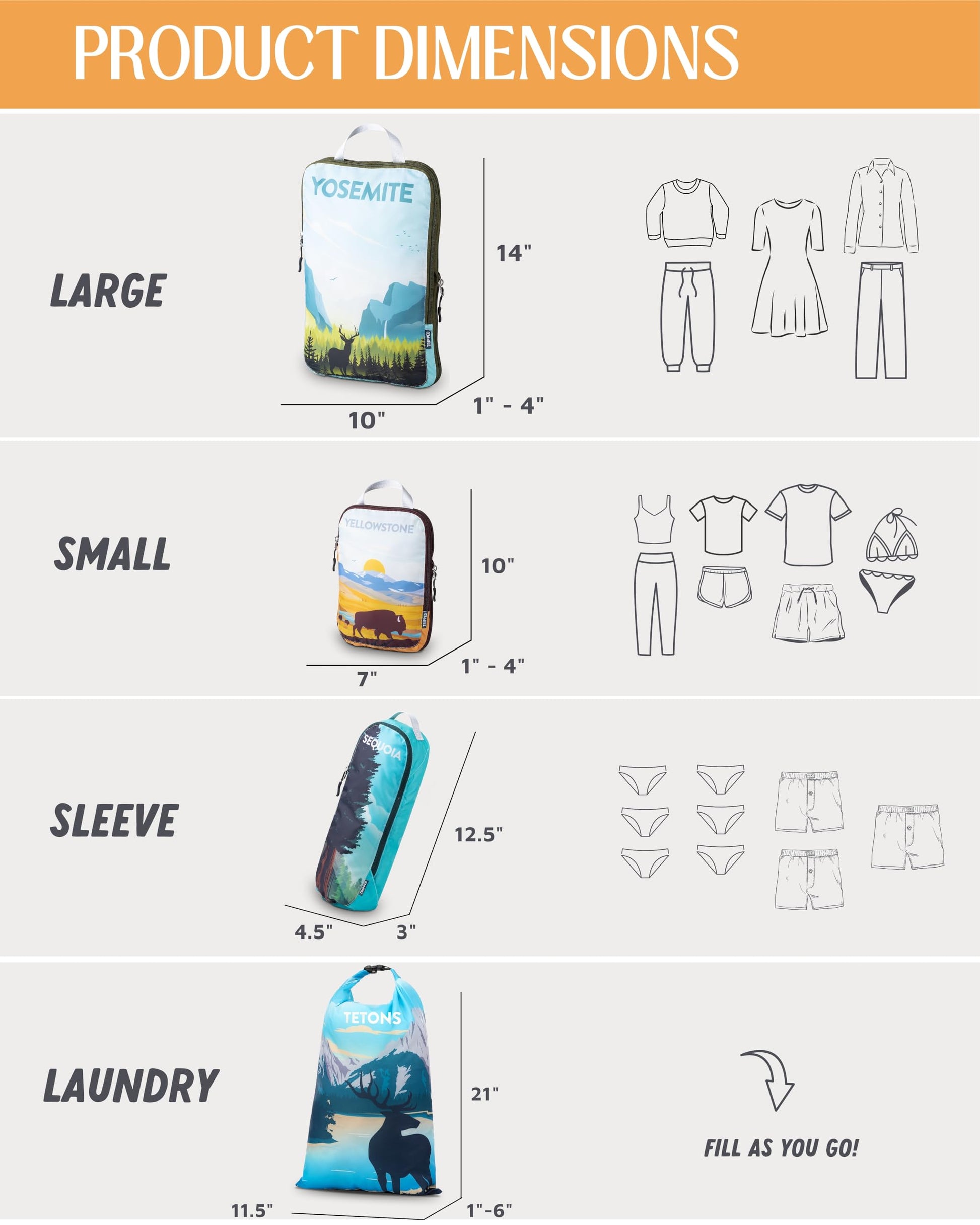 • HOW MUCH DOES THIS SET HOLD? Each set contains a different assortment of packing cubes. Large bag holds a week worth of shirts/ medium holds a week worth of underwear/socks. Example: Large holds rainjacket, zip hoodie, Longsleeve tshirt, and a cardigan. Small will hold 5 womens size medium tshirts. Large Dimensions Compressed size: 14x10x1in Expanded Size : 14x10x4in Small Dimensions Zipped/Compressed size 10x7x1in Expanded Size: 10x7x4in Additional bag sizes shown in picture gallery.