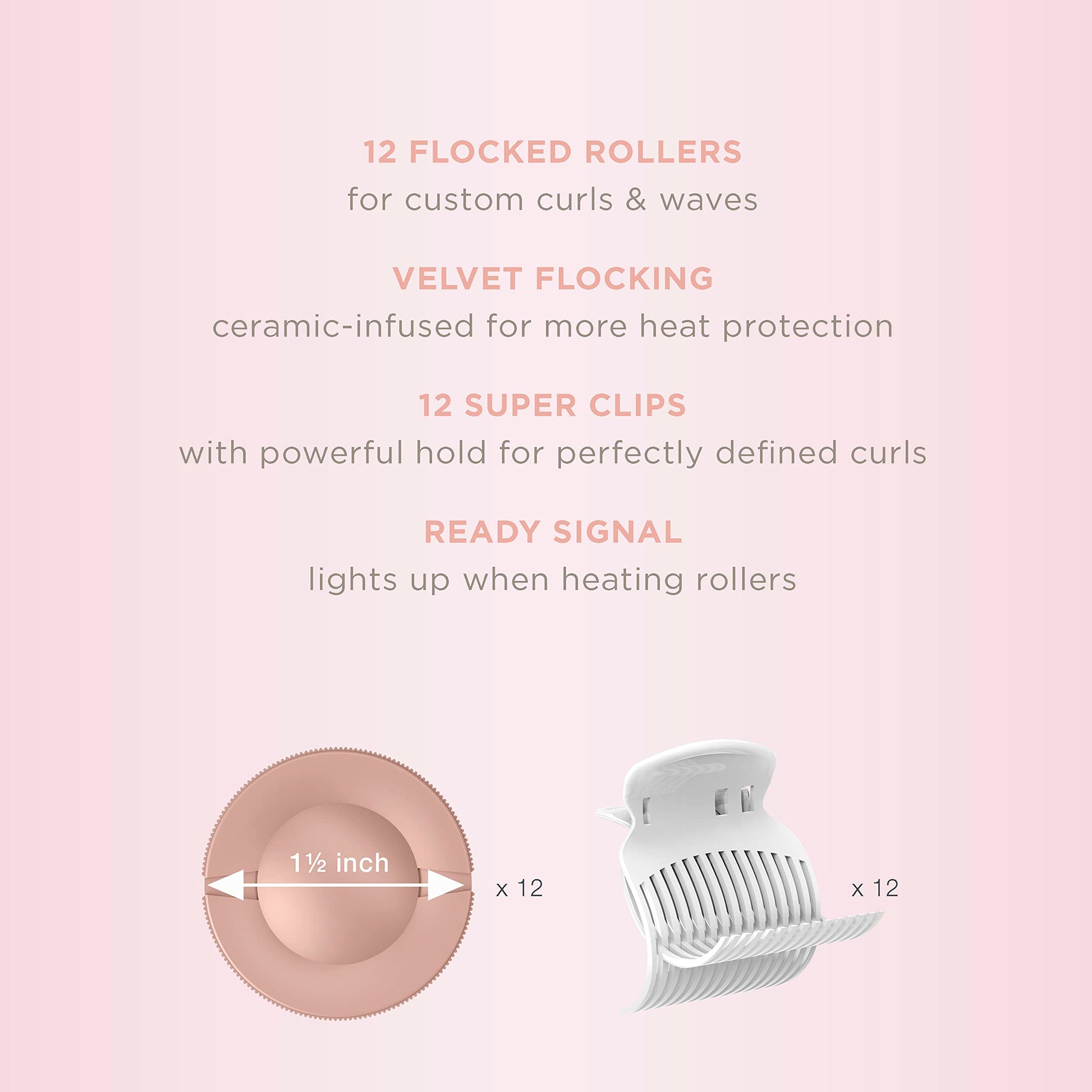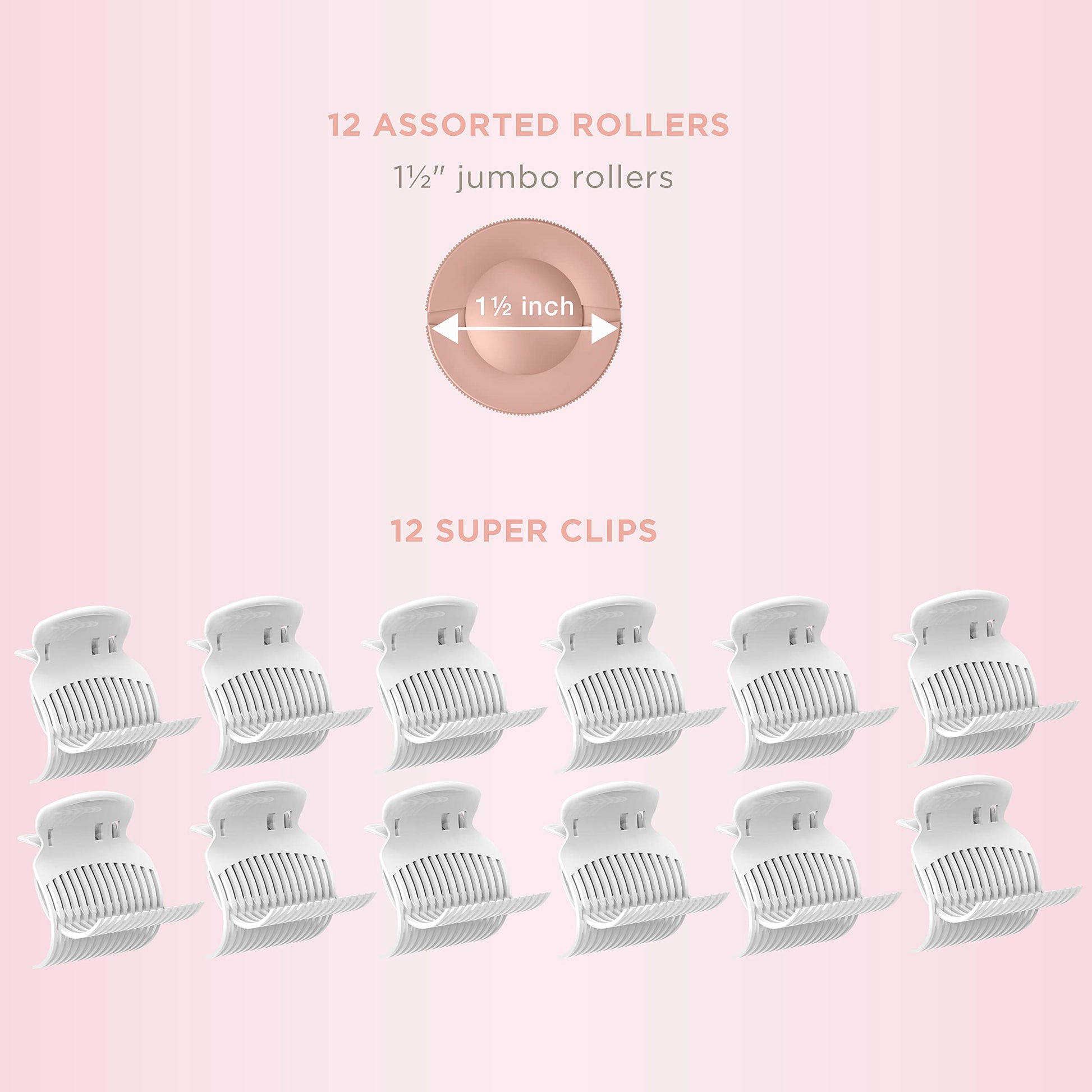- Full Set: Includes 12 ceramic flocked rollers in one size for custom curls and waves; Twelve 1 1/2 inch jumbo rollers; This special set includes 12 super clips to hold your hair securely and keep the rollers in place.