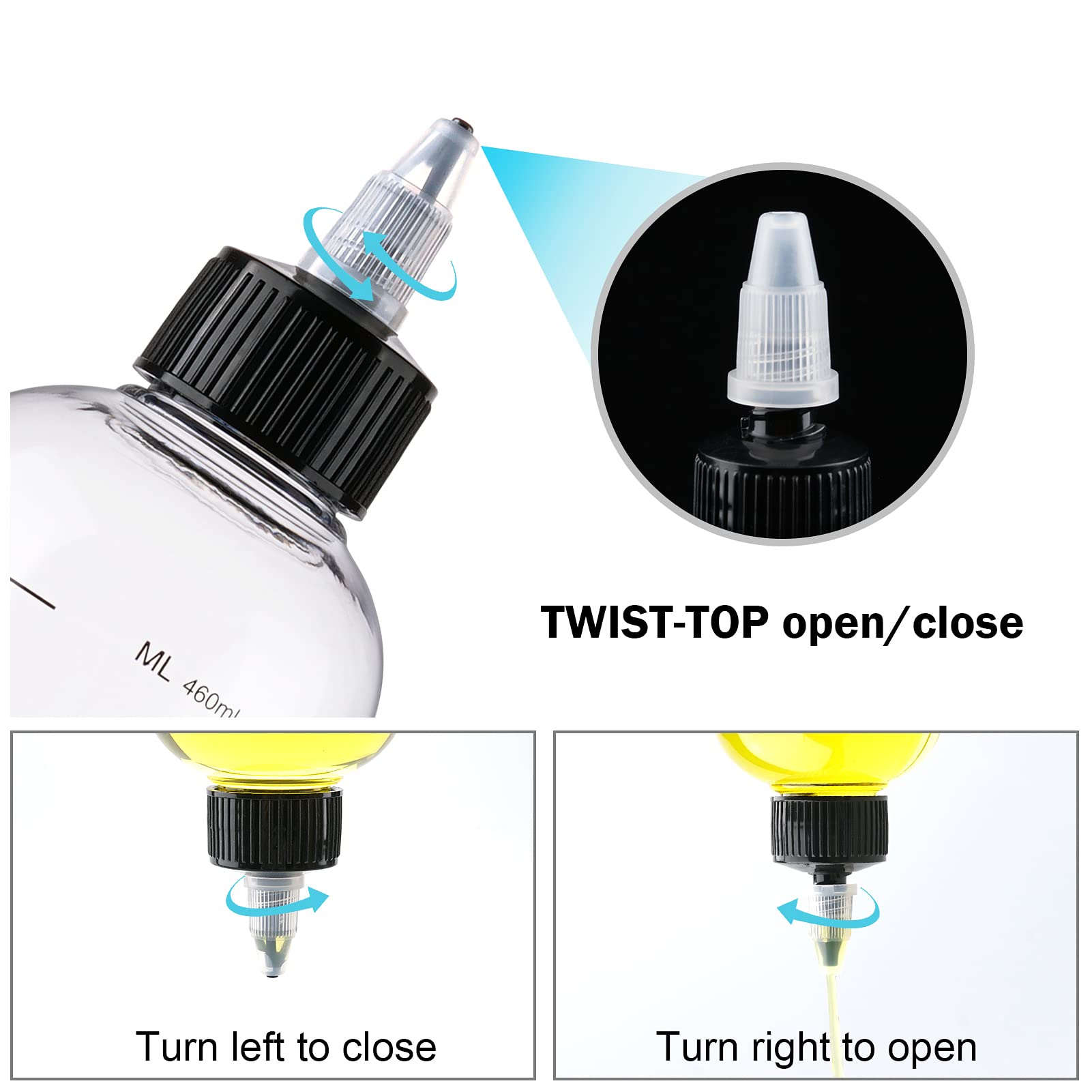 - Product Details: Twist-on top cap allows you to flexibly drip your liquid in similar drop size. This squirt bottle is very leak-proof, switchable cap avoids leakage of liquid and the precise scale can effectively control the amount used, which is more convenient.