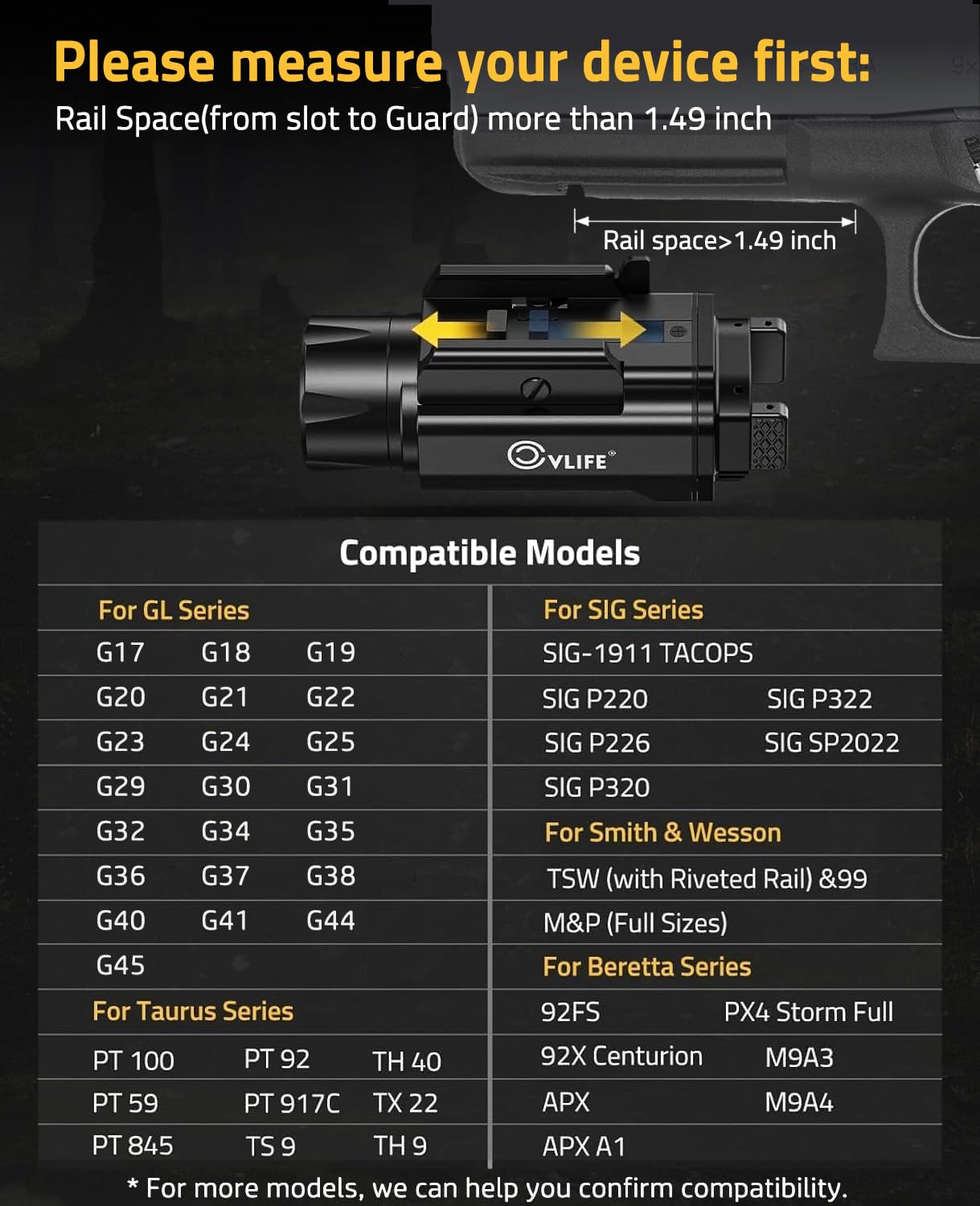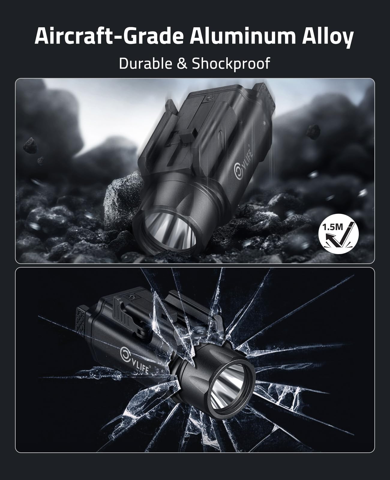 - SOLID & DURABLE - The pistol laser light is made of aircraft-grade aluminum, and the surface is anodized to be more wear-resistant and corrosion-resistant. The pistol light passed 1.5m drop test, which is more solid and durable than plastic gun lights.