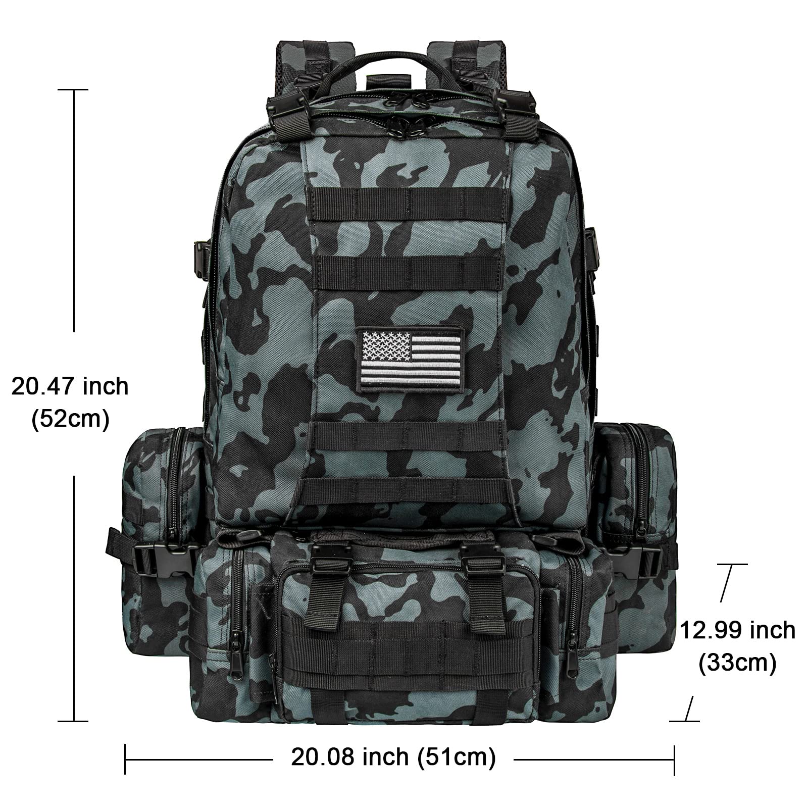 - Spacious military backpack has one main large compartment, one front detachable bag which you can use as a tactical fanny pack separately, two side detachable tactical backpack accessories bags as hiking sport bags. this multipurpose backpack can flexibly work as a 50L and 60L backpack.