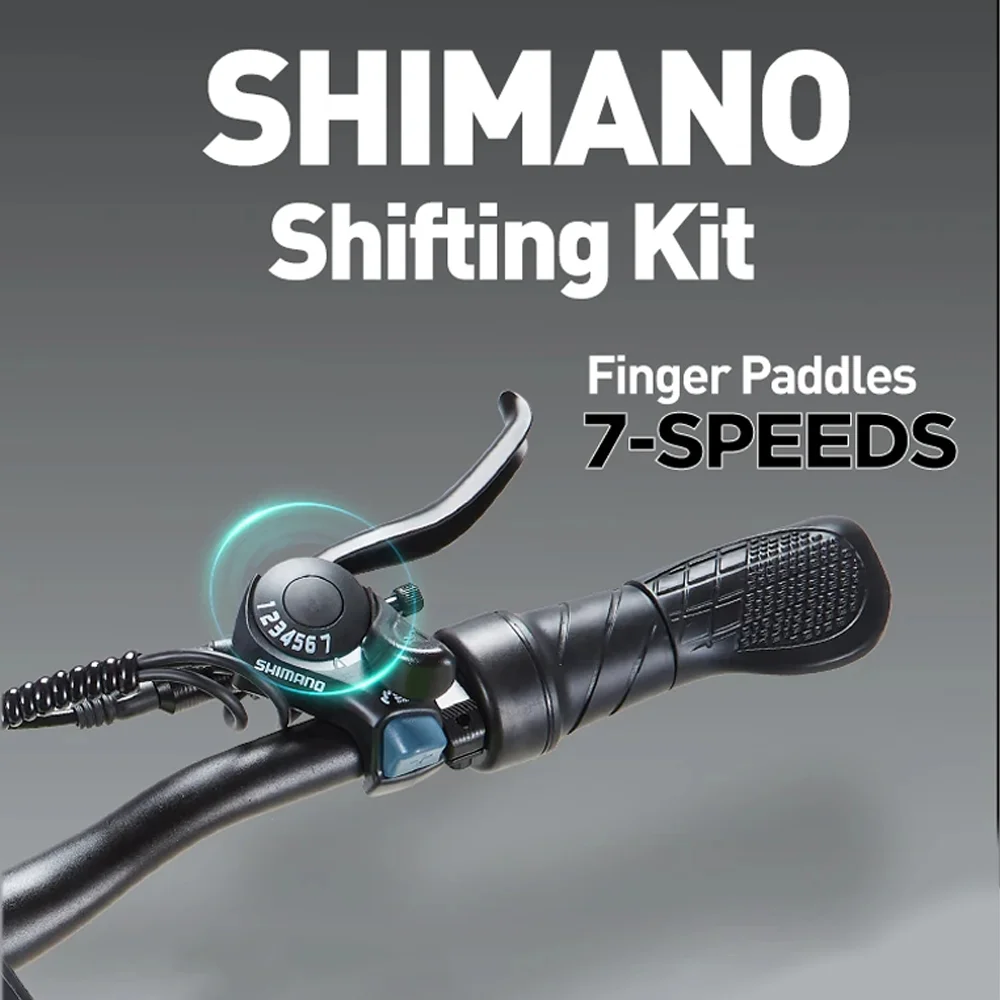 This e-bike features premium hydraulic brake and Shimano 7-speed system, which allows you to easily select different speeds for any type of road you want to ride.