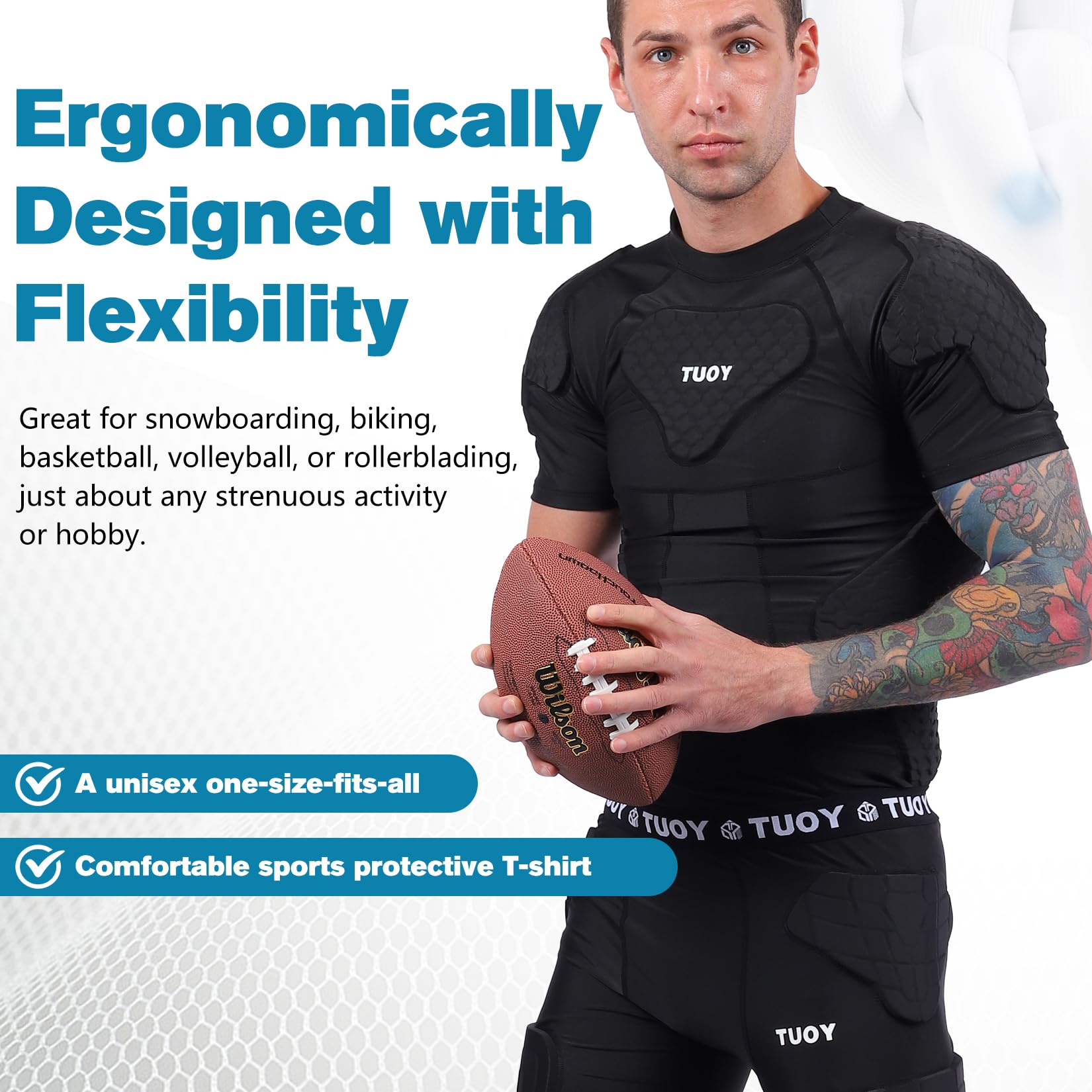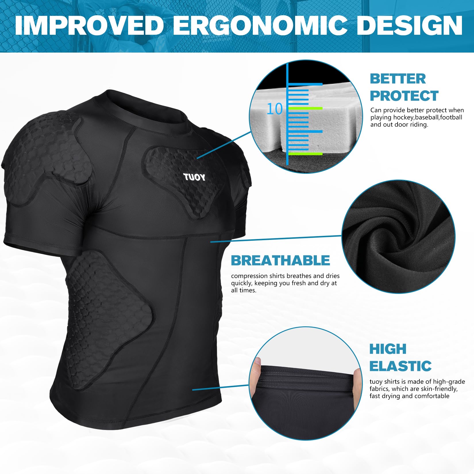 - HIGH QUALITY MATERIAL : This padded compression shirt is made of 90% polyester + 10% spandex . Made of high quality impact resistant material, it provides perfect cushioning protection for your exercise process.