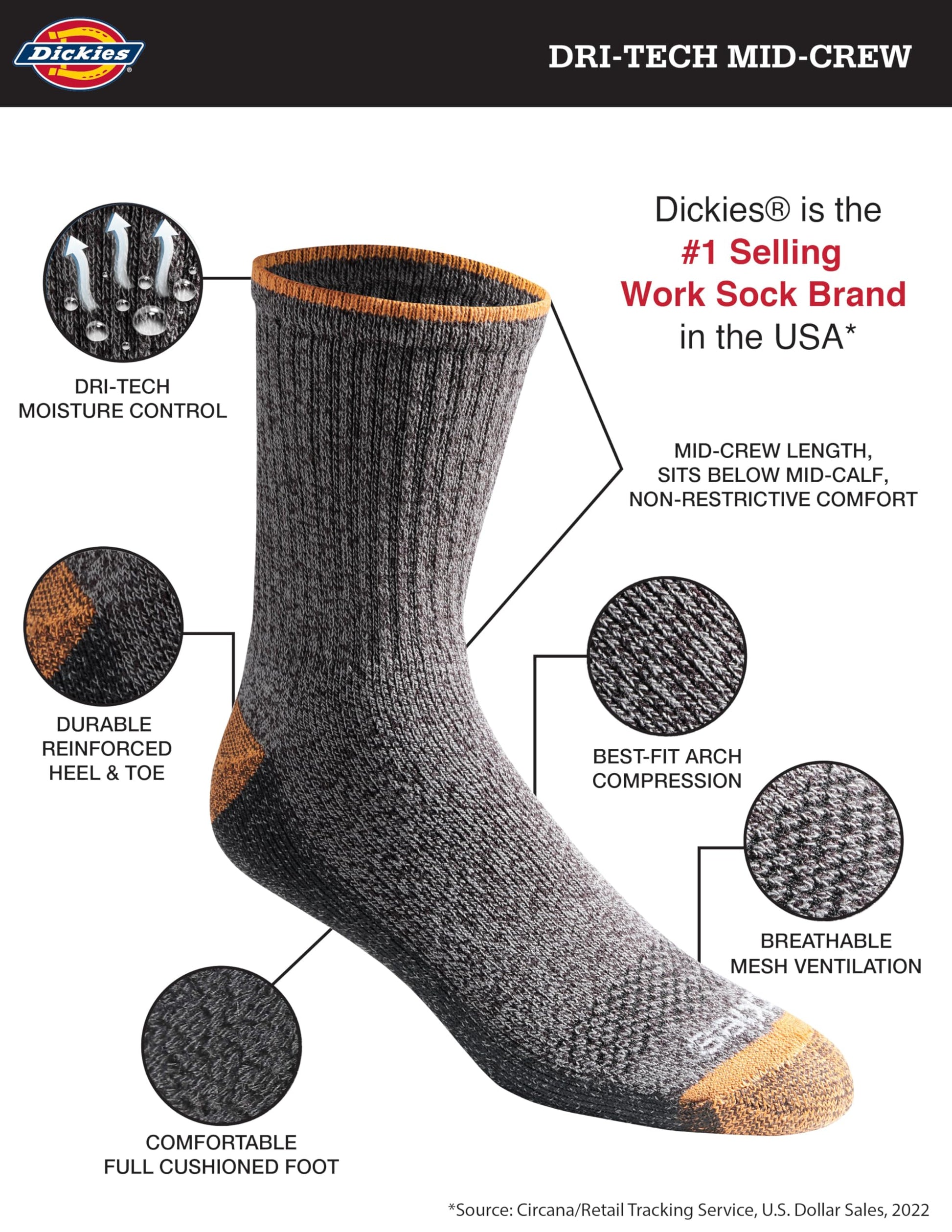 New Dickies Men's Dri-tech Moisture Control Comfort Length Crew Socks 6 and 12 Pairs with 70% Cotton blend better Fit and better value – Dri-tech Control Comfort Length Crew Socks Product, Engineered with Soft Breathable Moisture Control Fibers and Full Cushioned Footbed, Ventilation Channels Enhance Air Flow to Provide Rugged Durability and Comfort, Double Reinforced Heel and Toe, and Arch Compression Support & Stability.