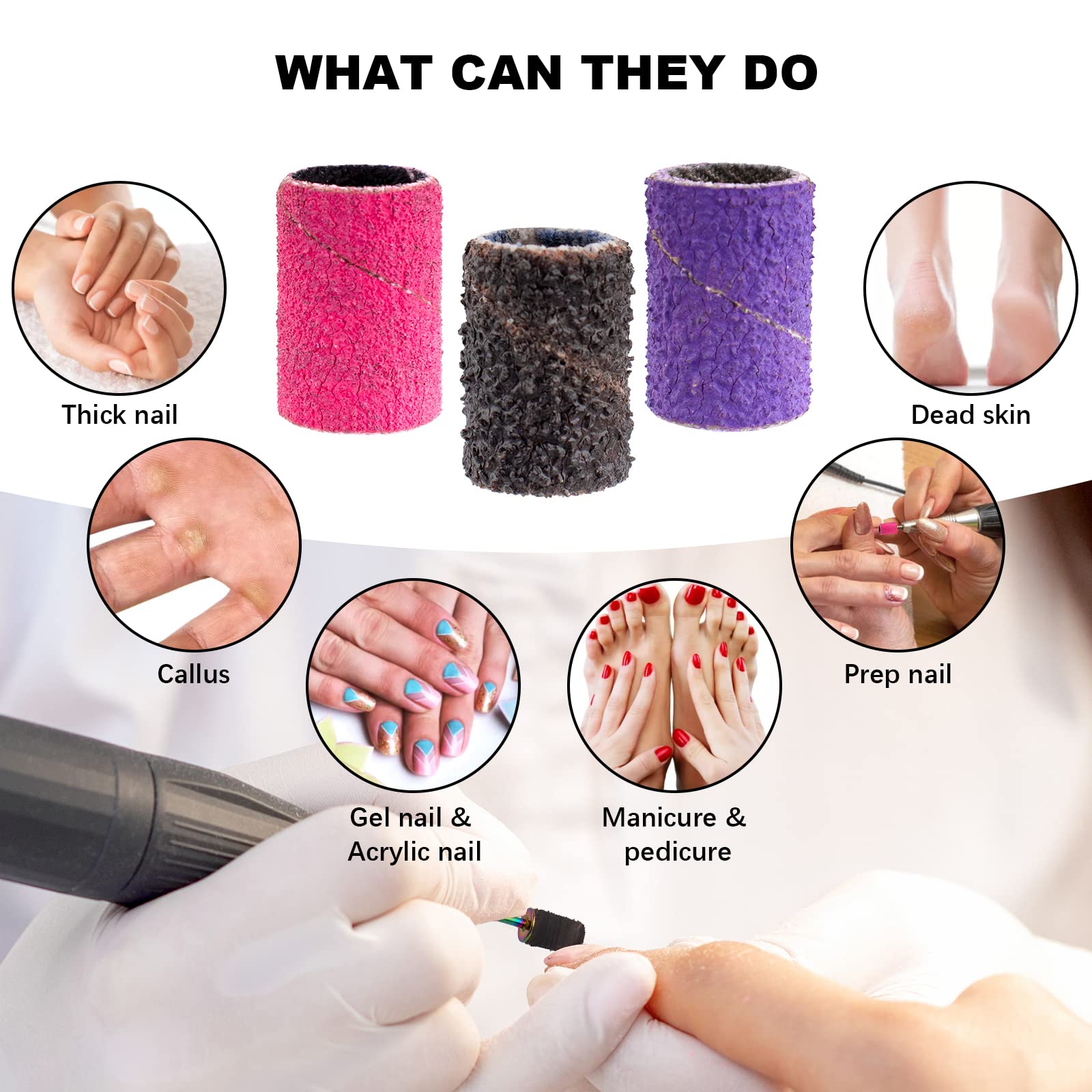 - Multi-functional nail drill sanding bands:The nail drill bit set are suitable for most size 3/32 inch electric nail drills and other drill bits using sanding bands can polish,shape,shorten,smooth and polish natural and artificial nails,remove gel nail dip powder poly nail gel and so on,great nail accessories for any professional manicurist or nail beginners