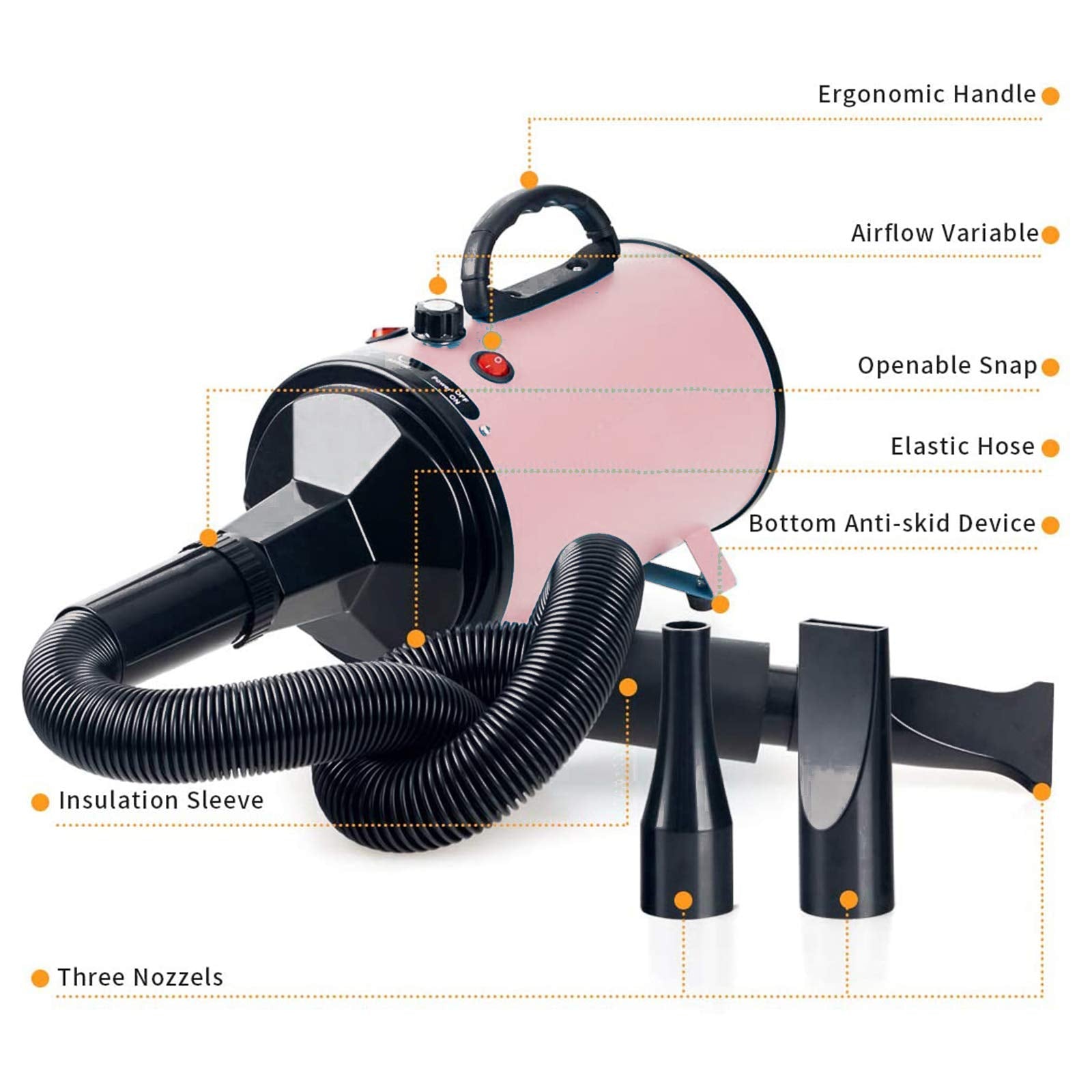 - [Powerful Blow Force & Stepless Adjustable Speed]Professional pet hair dryer equipped with a powerful and stable motor. Output power: 700W-2000W. Stepless Adjustable Speed. Whether it's a giant dog or mini cat, it can quickly dry. You can choose different wind level with your pet size. Give your lovely pet a thorough dry after shower. Also it can be used for dry your car.