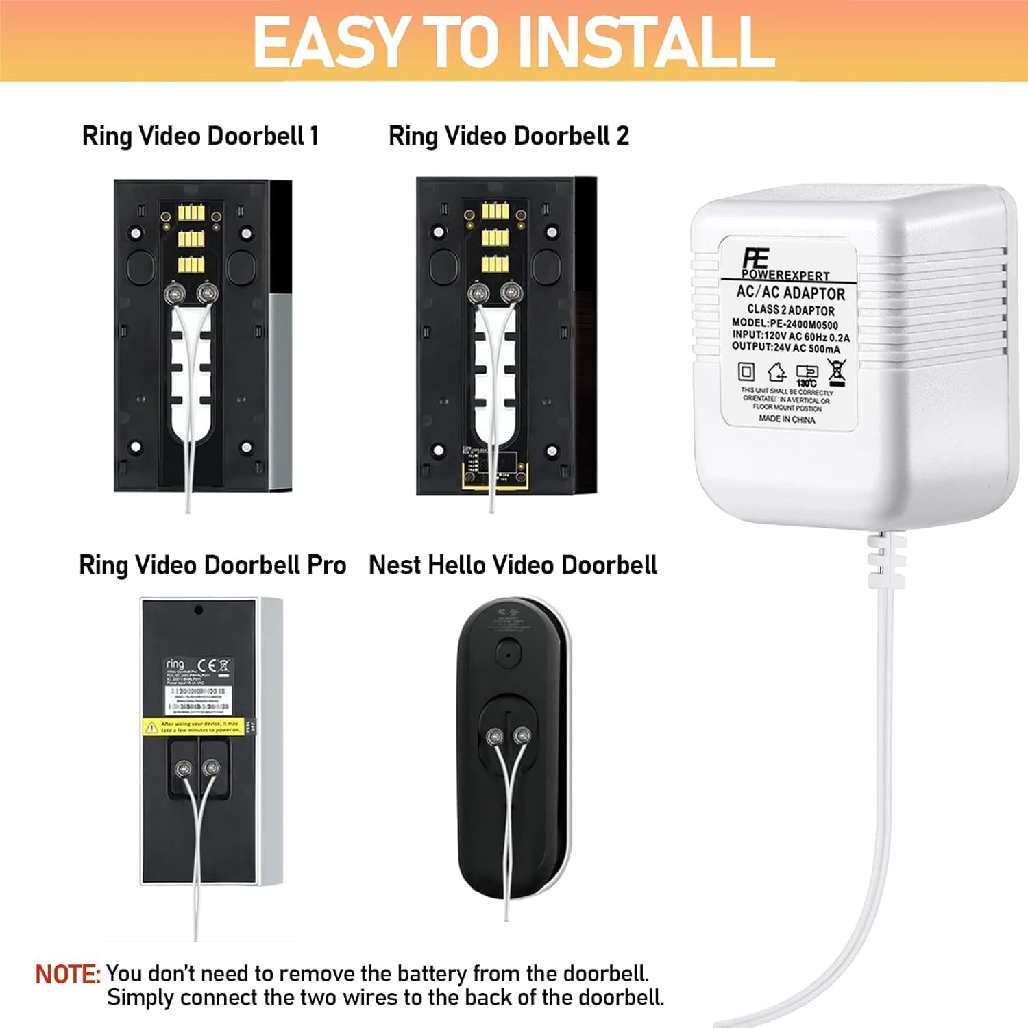 - Wide Compatiblity - 24v universal US power cable powers popular smart doorbells. Compatible with Ring video doorbell (2020 release, 3/4/plus, and pro 1/2), Nest, Eufy, Skybell, Arlo, etc. Continuously converts 110/120v to 24volt 500ma.
