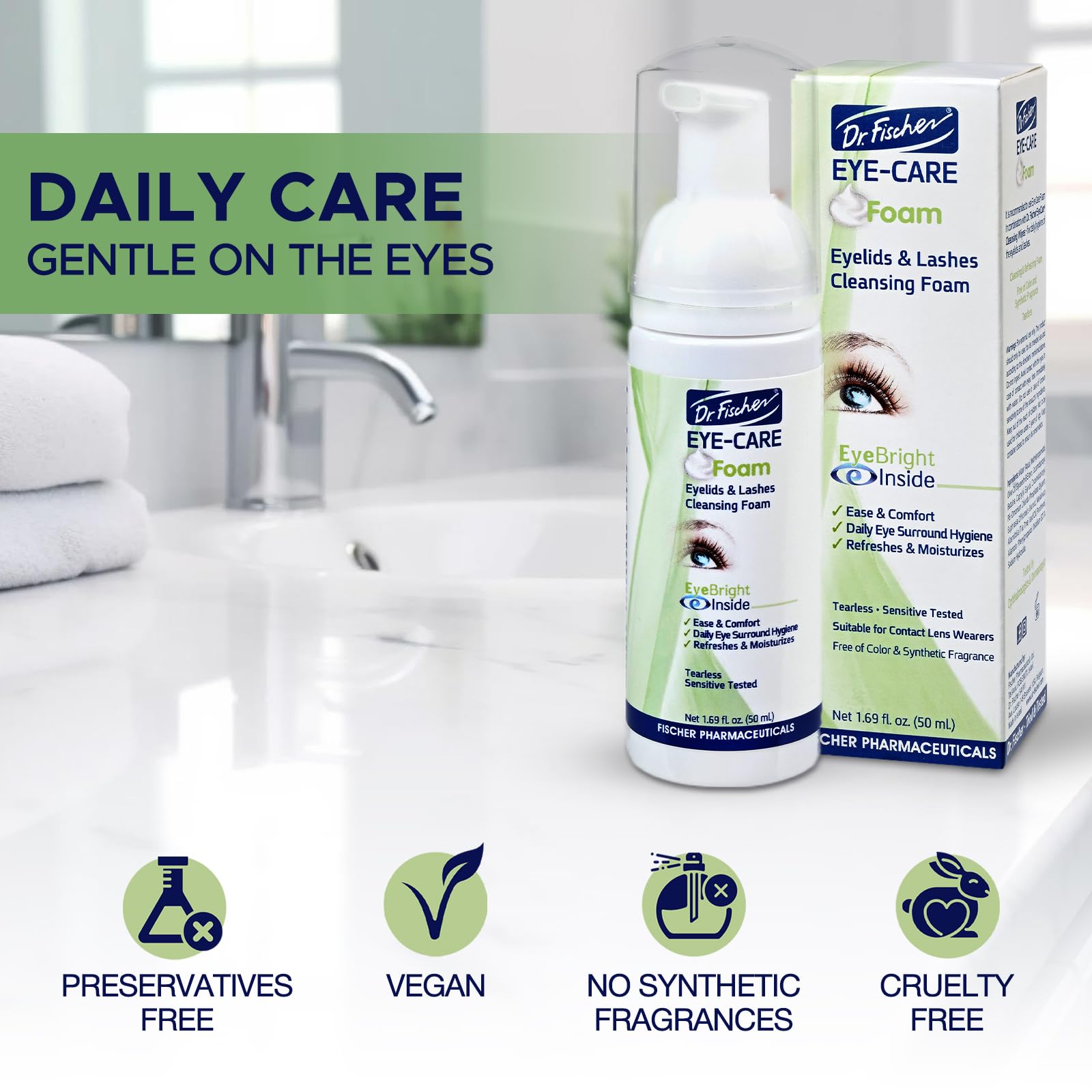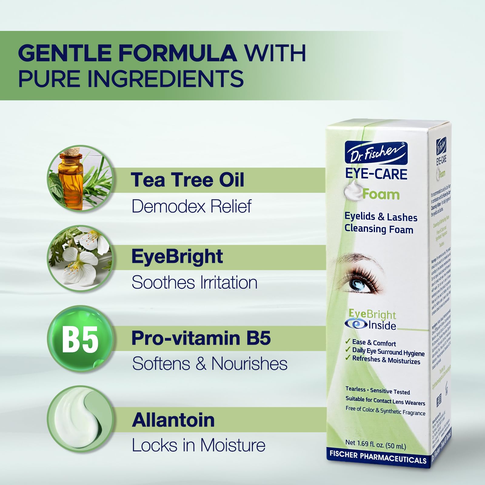 Details: DR. FISCHER IS COMMITTED TO USING ONLY THE BEST INGREDIENTS Every ingredient is carefully chosen for its effectiveness and safety, minimizing the risk of sensitivity. We know eyes! Dr. Fischer's specialization in the R&D and manufacturing of ophthalmological preparations goes back to 1965. We created Eye Care Foam to make it easier for you to care for your daily eye hygiene for an extended period of time- up to 6 months from opening.