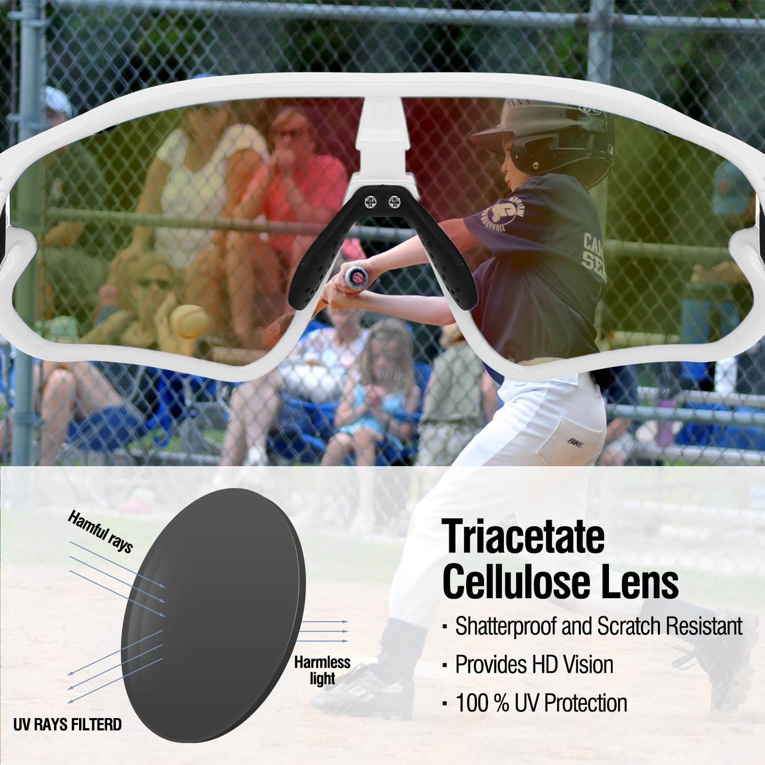 - 【DESIGNED FOR SPORTS】 -- These youth sports sunglasses offer 100% UV protection and clear vision,making them ideal for outdoor sports,such as baseball,softball,climbing,driving,fishing,golf,hiking,running skiing,cycling and so on.