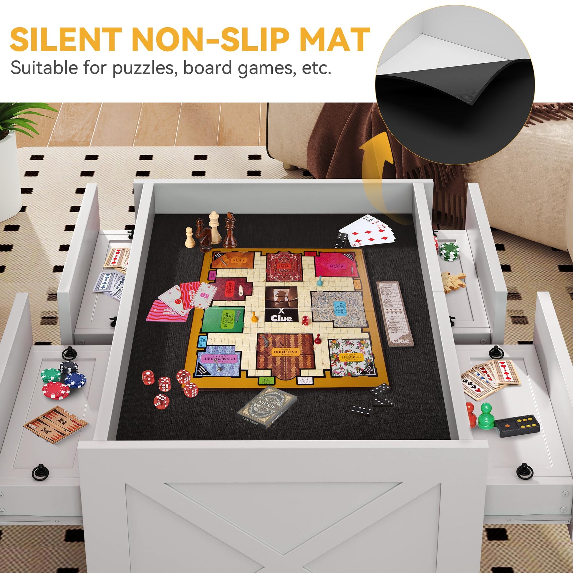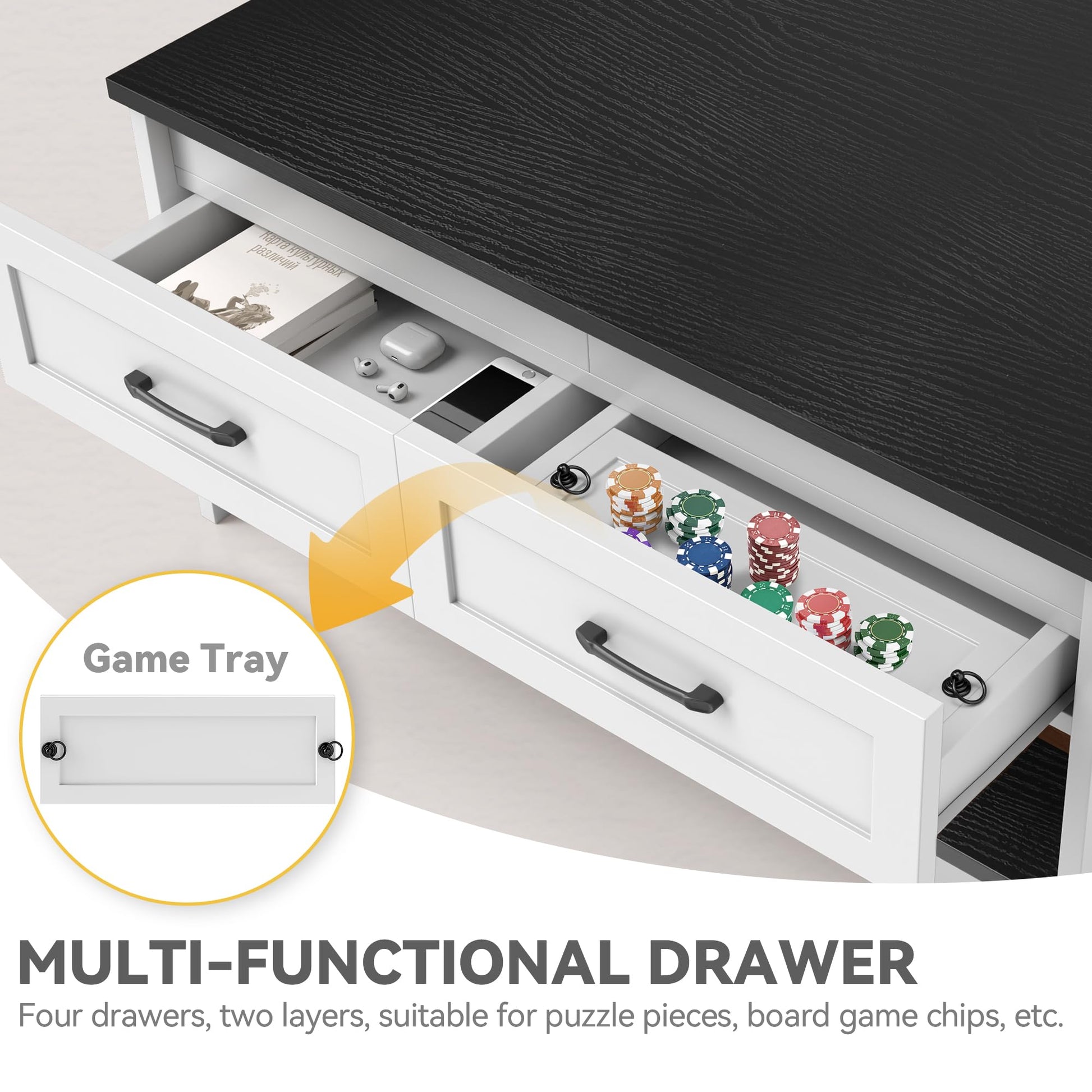 - Convenient Charging & Storage: Equipped with a built-in power outlet for device charging and four spacious drawers with removable trays to organize game components and puzzle pieces efficiently