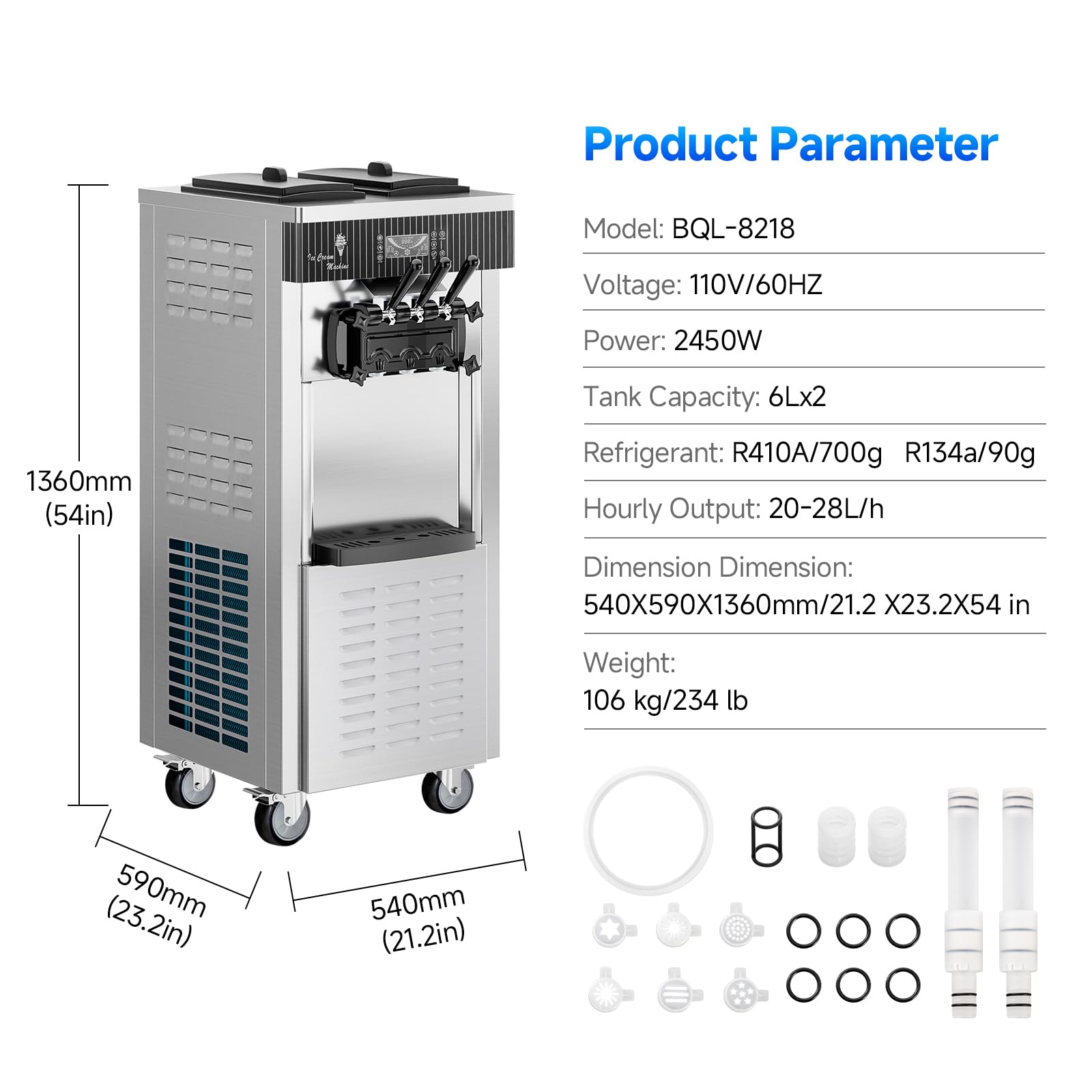 - Large Capacity for Commercial Use:our commercial soft serve ice cream machine produce an 20-28 quarts per hour. with 2x 6L hoppers and 2L cylinders crafted from food-grade stainless steel, it can deliver 150-200 servings of ice cream in one hour,Offering 2 single flavors and 1 mixed flavor,meeting the demands of your business.And it is widely used for snack bars, cafés, bakeries, restaurants,etc.