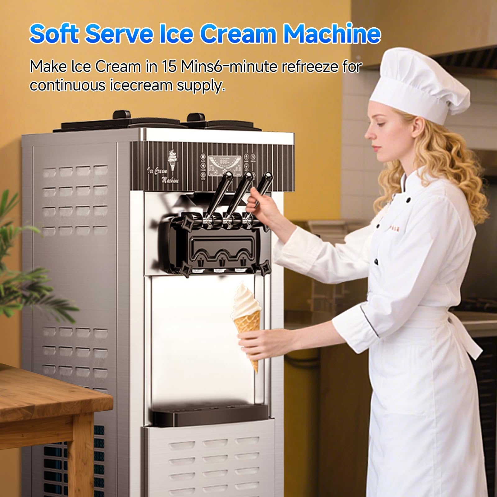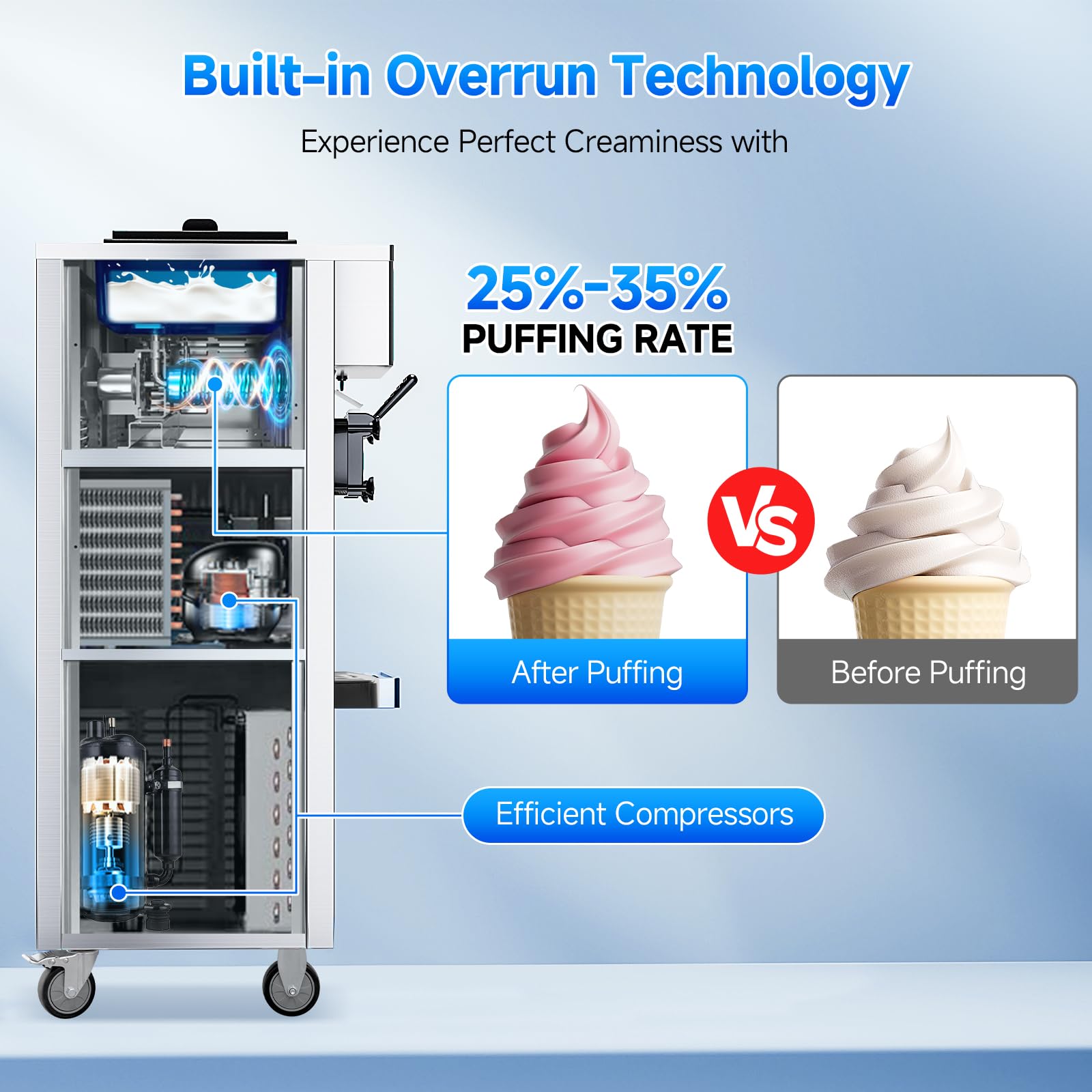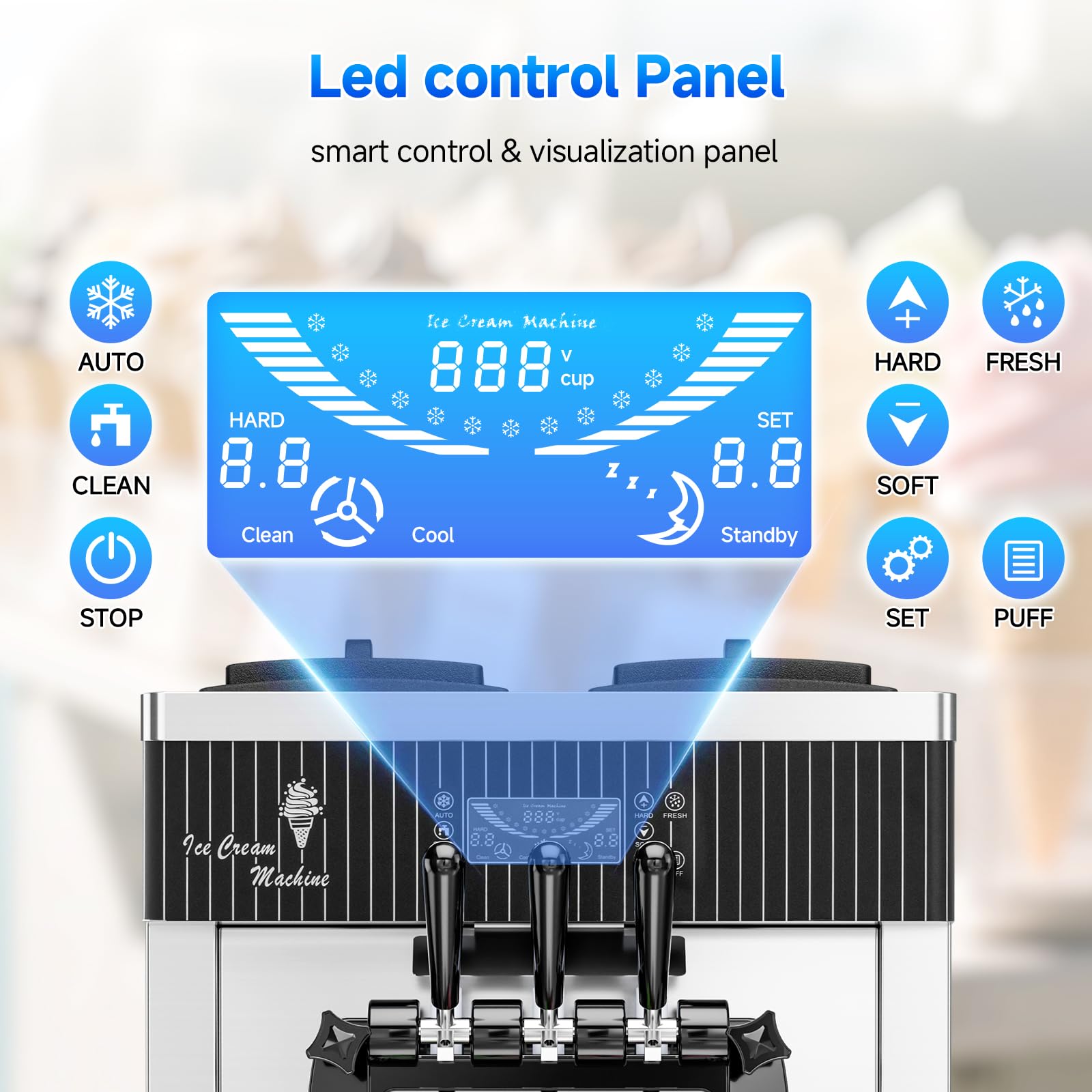 - Smart Designs Easy to Clean & Operation: Our soft-serve ice cream machine features a smart LCD control panel, allowing for convenient operation.The pre-cooling function ensures its fresh taste even over night. Monitor the quantity of ice cream with ease on the LCD screen,while practical function enable you to adjust the ice cream texture to your preference. Plus,enjoy effortless maintenance with self-cleaning activated with just one click.With detailed manual support you easy to installation and operation