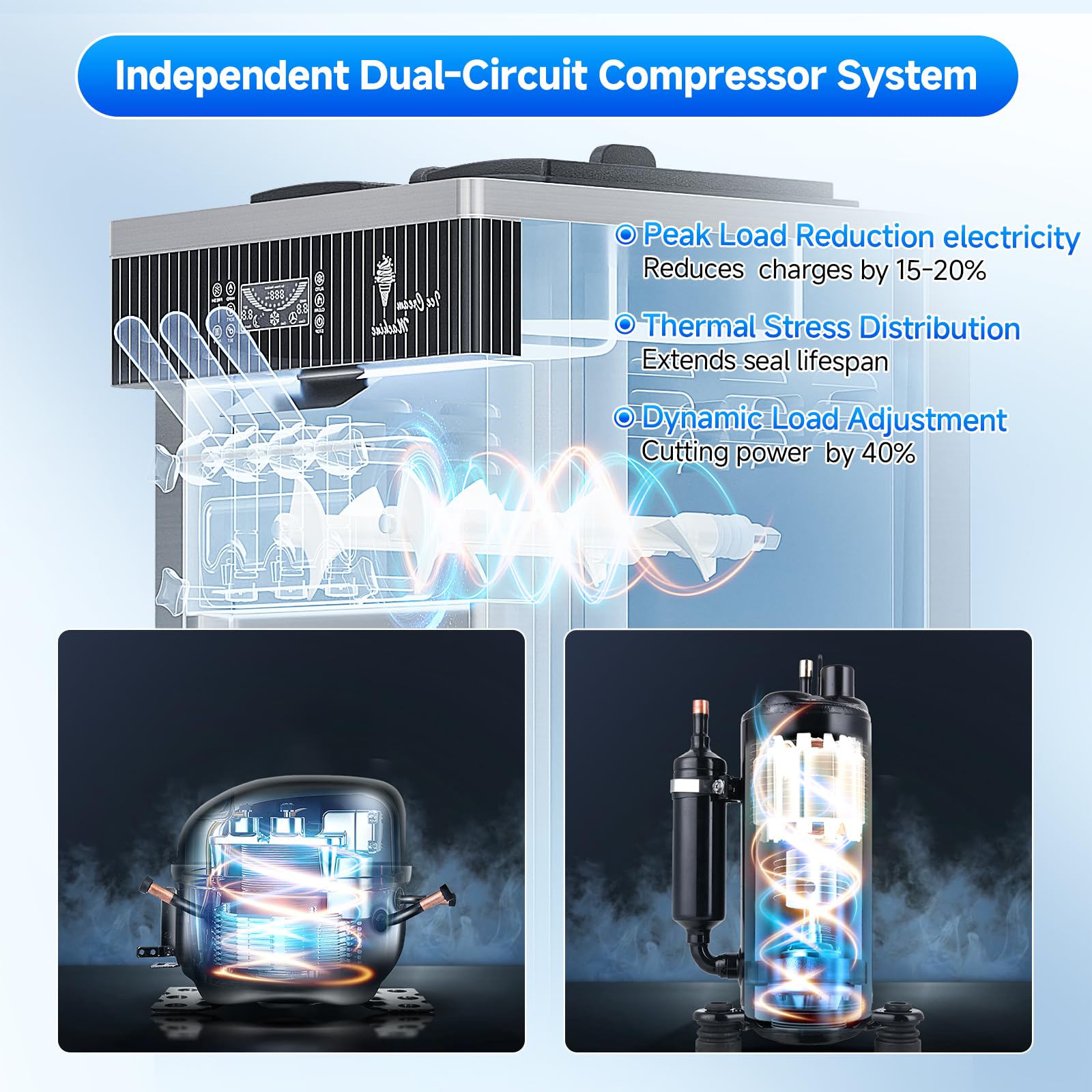 - Enhance ice cream Energy-efficient:This upgraded commercial ice cream machines features Independent dual-circuit Compressor system, Staggered startup timing of dual compressors prevents power grid surges. For commercial venues with time-of-use electricity pricing, this reduces demand charges by 15-20%,It adopts 2450W for powerful compressor and copper condenser for rapid cooling, energy-saving,and low noise,with expansion tubes enhancing the appearance of your ice cream and increasing yield by 25%-30%.