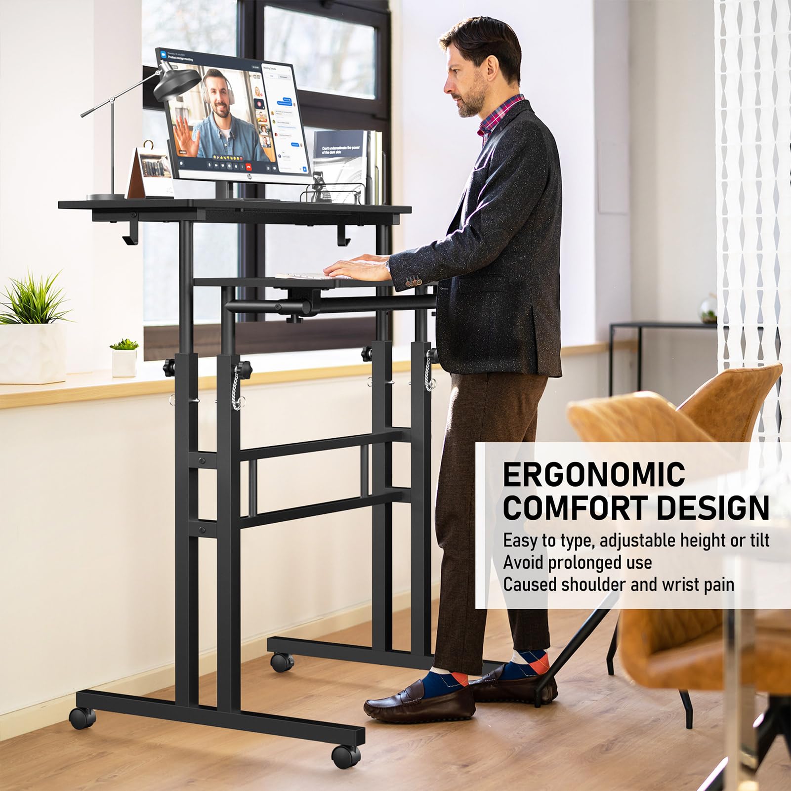 • Ergonomics Standing Table Adjustable Height: Changing between sitting and standing helps you to relieve fatigue,avoid health problem of sitting and improve your working efficiency, rolling desk reduces back and neck pain,provide a more healthy working position for you