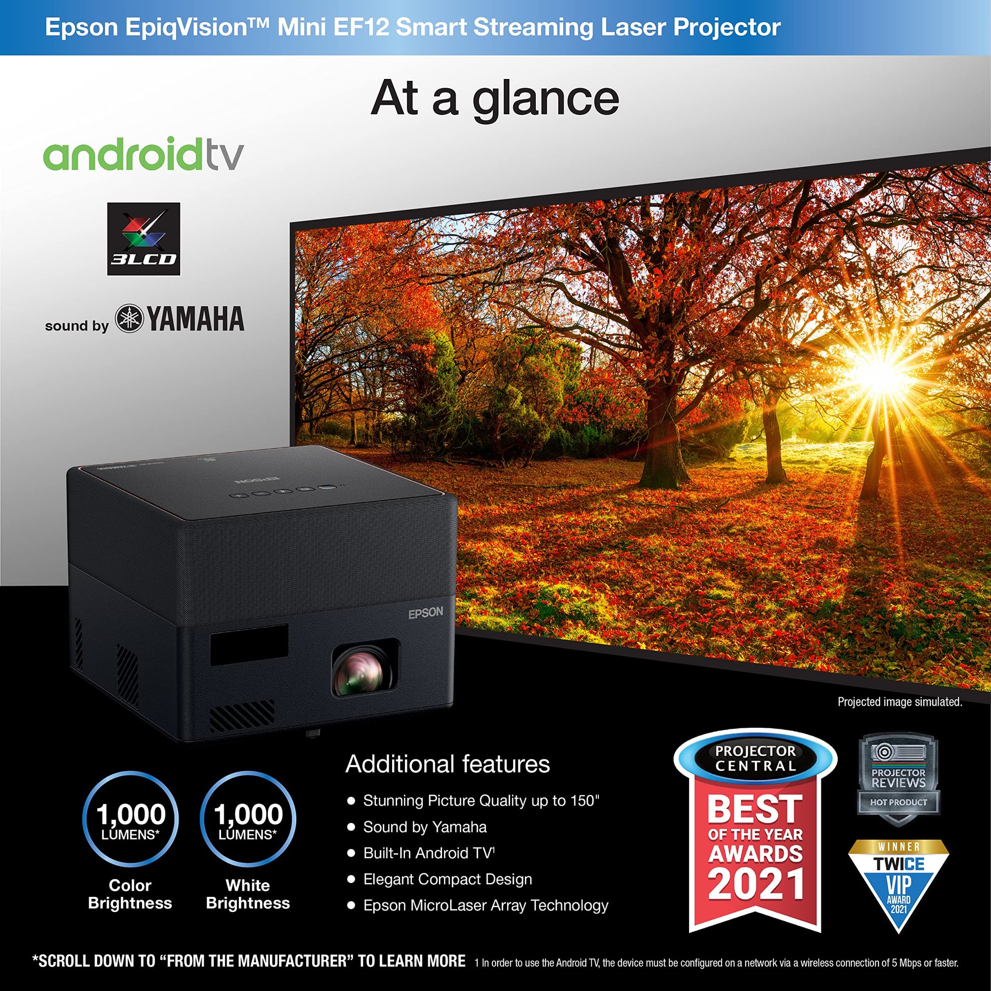 Epson EpiqVision Mini EF12 Smart Streaming Laser Projector, HDR, Android TV, Portable, sound by Yamaha, 3LCD, 1080p, 1000 lumens Color and White Brightness (Renewed)