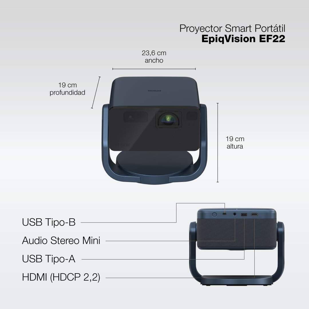 Epson EpiqVision Mini EF22 Portable Smart Laser Projector, Bright 1,000 Lumens, FHD 1080p HDR, 3-Chip 3LCD, Google TV, Netflix, Swivel Stand, Stereo Speakers, Outdoor Backyard/Home Theater - Blue