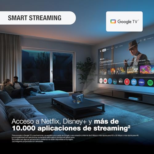 1. To access Google TV and its features, a Google account and an Internet connection of 5 Mbps or faster for HD or 25 Mbps or faster for 4K is required. Third-party app compatibility subject to change without notice. | 2. Some apps and/or content may not be available in your region. | 3. Live TV recommendations available in the US only. Subscription(s) required to access certain live TV content. | 4. Available for images 30' to 100'. | 5. Color brightness (color light output) and white brightness (white light output) will vary depending on usage conditions. Color light output measured in accordance with IDMS 15.4; white light output measured in accordance with ISO 21118. | 6. No required maintenance for the light source for up to 20,000 hours. Approximate time until brightness decreases 50% from first usage. Measured by acceleration test assuming use of 0.04 – 0.20 mg/m3 of particulate matter. Time varies depending on usage conditions and environment. Replacement of parts other than the light source may be required in a shorter period.