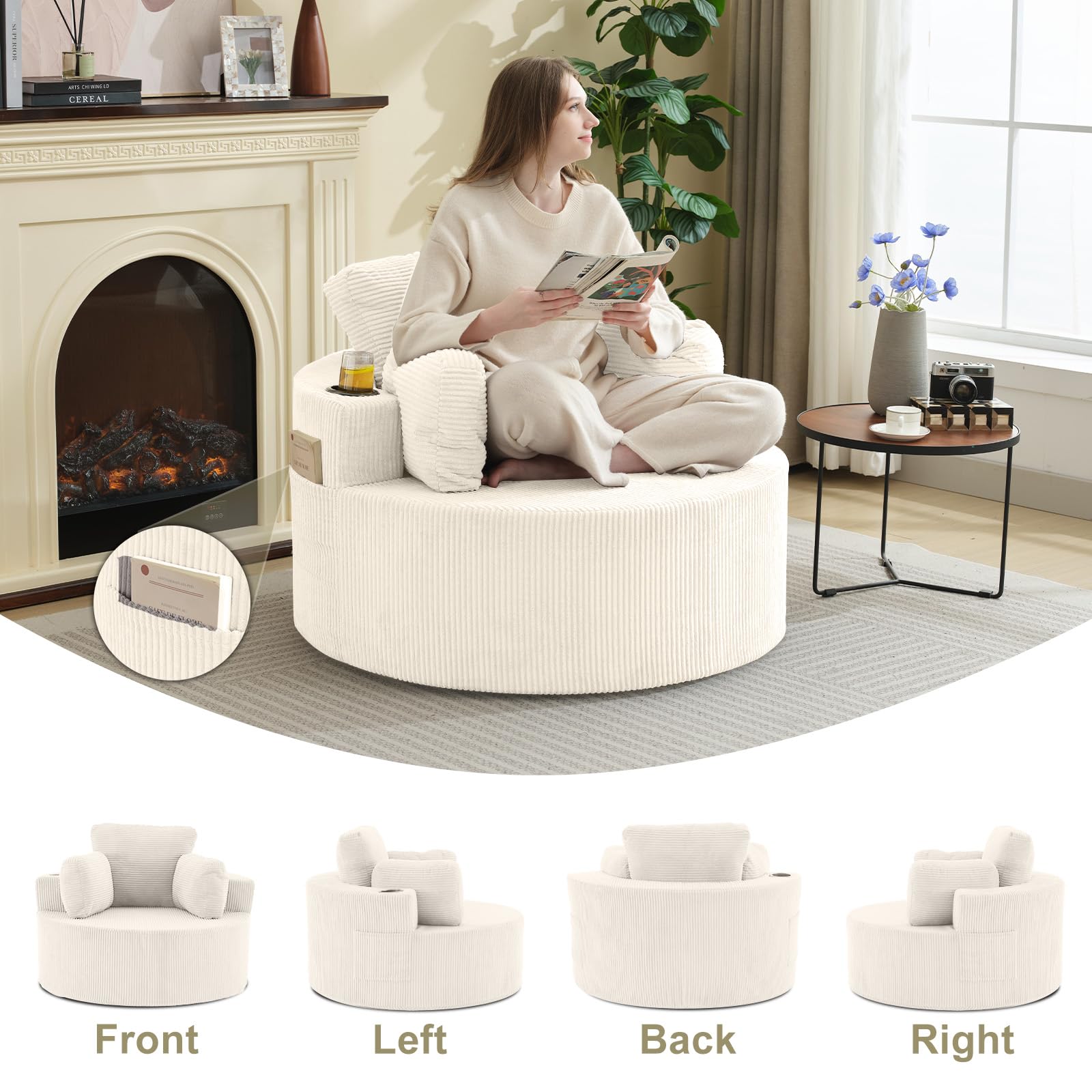 - Comfortable Barrel Chair: the fabric is corduroy ,soft and comfortable feel;internal filling high-density foam,good resilience, not easy to collapse when sitting for a long time.The large pillow mainly provides back support, while the two small pillows provide side support.Let you fully relax on the round swivel chair and enjoy a wonderful leisure time.