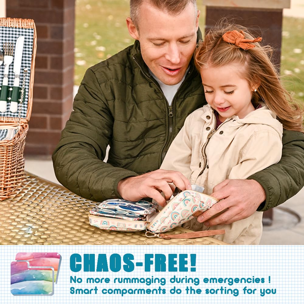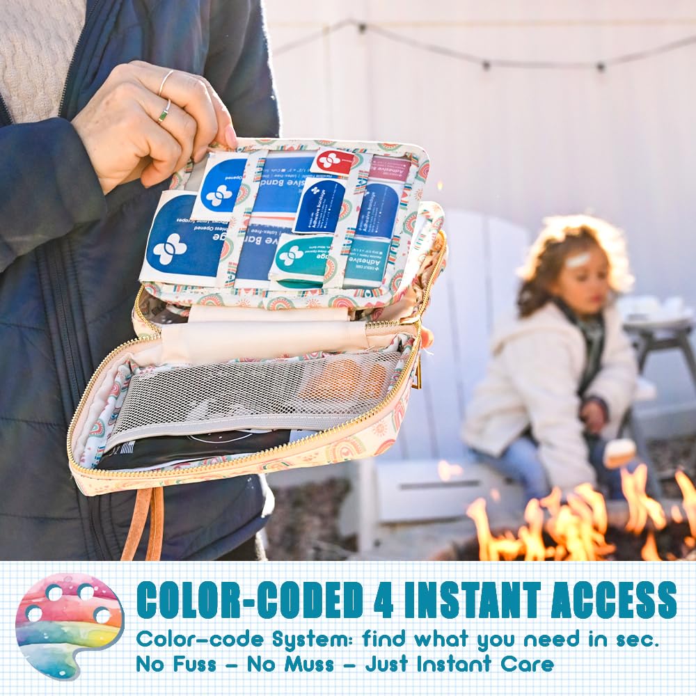- 🌈 Travel-Friendly Organization: Our first aid kit is meticulously designed to ensure quick access during travel emergencies. Our supplies are neatly organized in designated compartments, all in one compact and portable storage bag, allowing for quick grabs during emergencies, making it perfect for parents on the go!