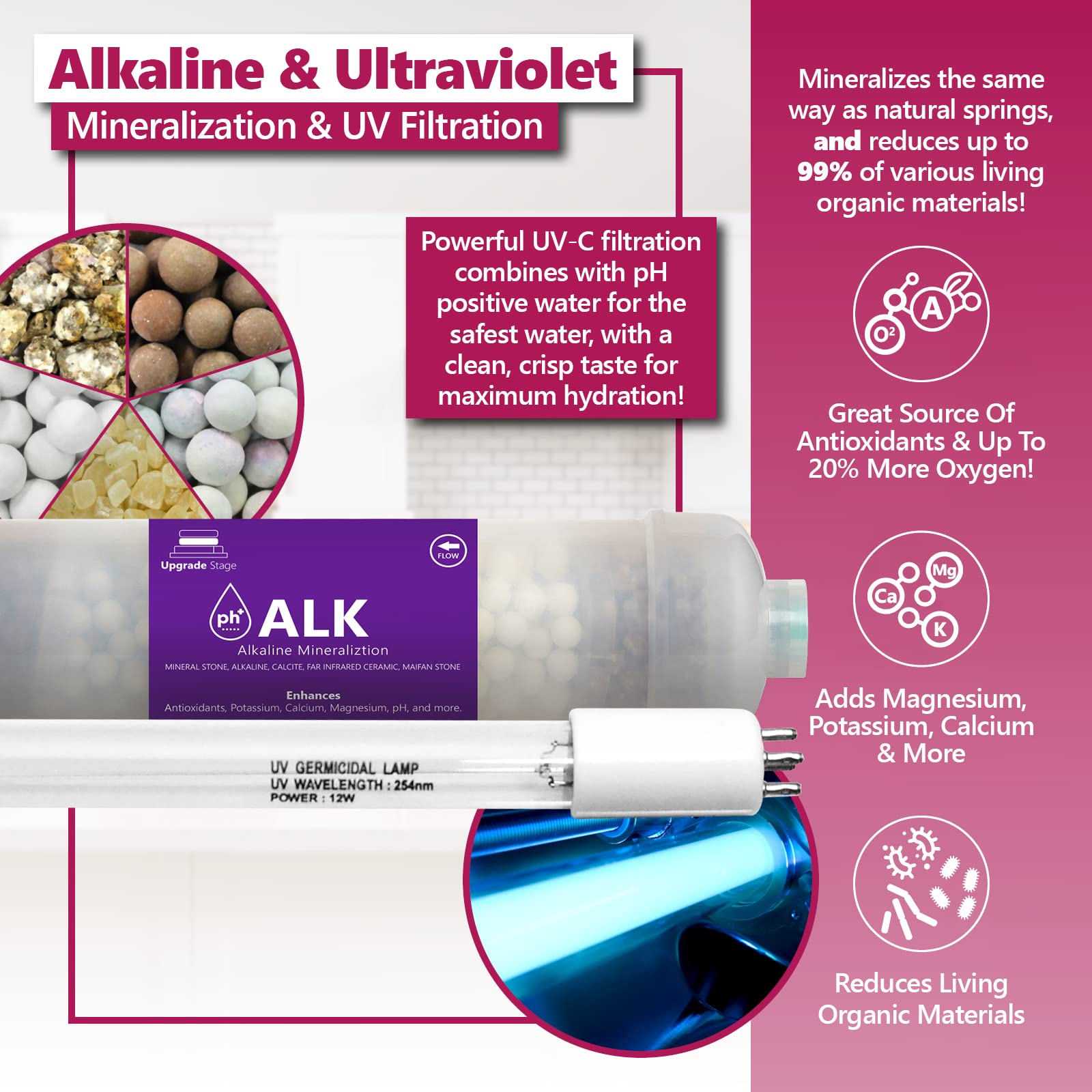 Details: Your water is mineralized totally naturally with our Active Mineral technology. Our minerals are ionically activated so your water picks up more mineral content as it passes through five types of mineral rocks. This is the same way that the healthiest natural springs on Earth add minerals. You can trust your water with powerful UV-C Filtration. It’s the safest water available, right in your home. The UV light is equipped with a warning light that will alert you when the power of the UV falls below the allowed range.