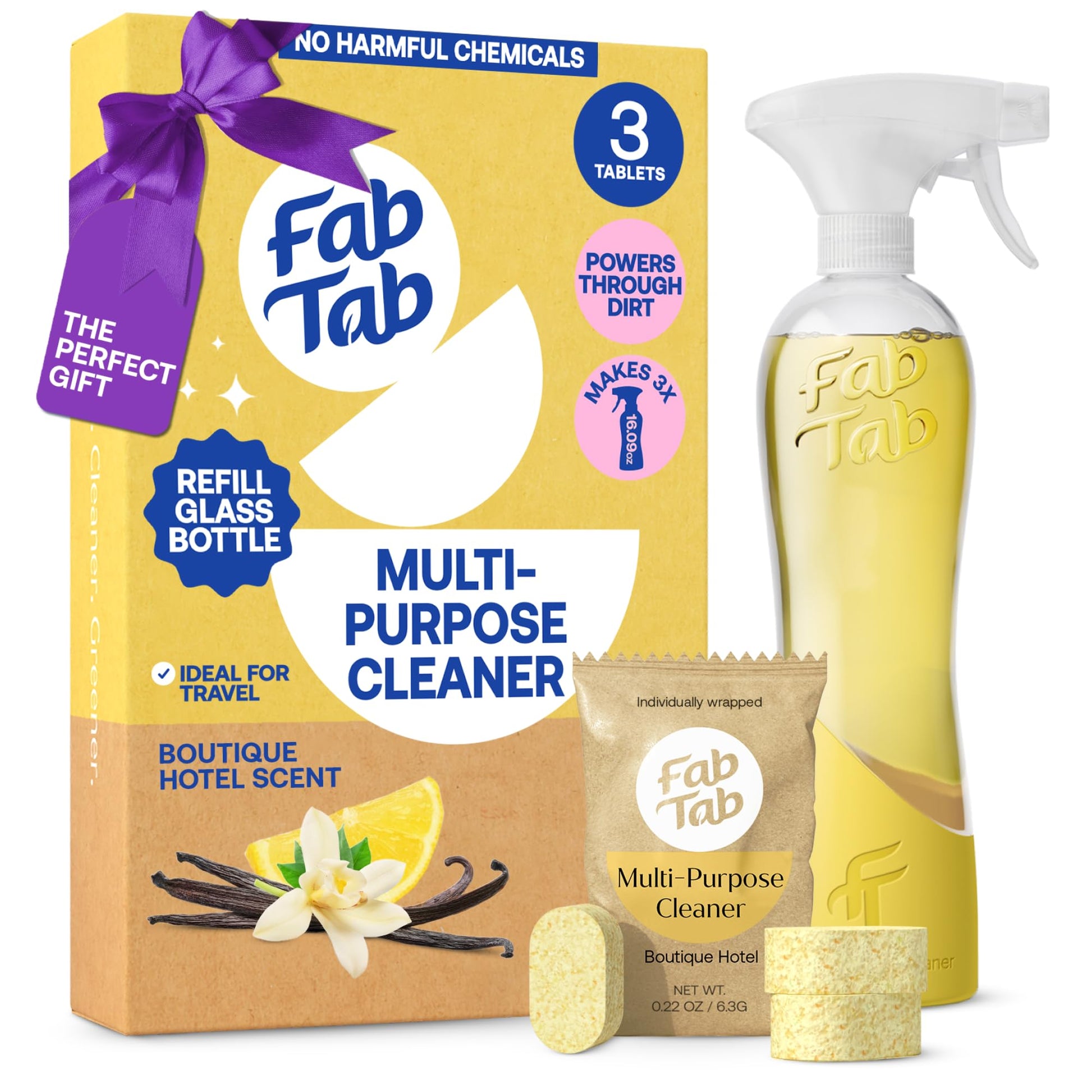 Fab Tab Multi Purpose Cleaner Cleaning Tablets, Eco-Concious Refillable Glass Bottle System with Boutique Hotel Scent, Safe For Family and Pets - Chemical-Free, Plastic-Free - 3 Count
