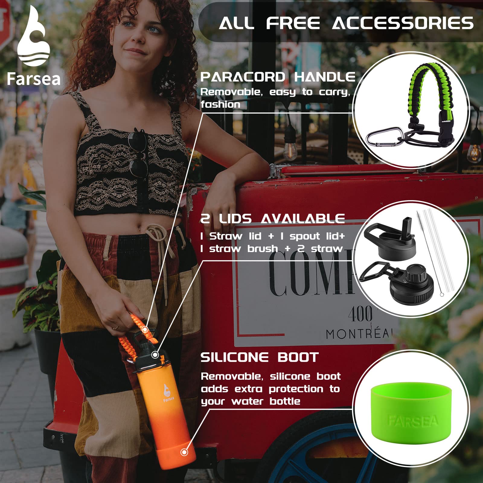 - WHAT YOU'LL GET: Farsea is committed to providing the best value and highest quality to the customers; We offer Continuous After-sales Service and Solve All Problems; We offer several different capacity bottles(12 oz, 18oz, 24 oz, 32 oz, 40oz) and you can choose according to your needs; Package: Comes with 2 lids (Straw lid & Spout Lid), paracord holder, protective Silicone Boot, nice packing box, 2 straws, and straw brush