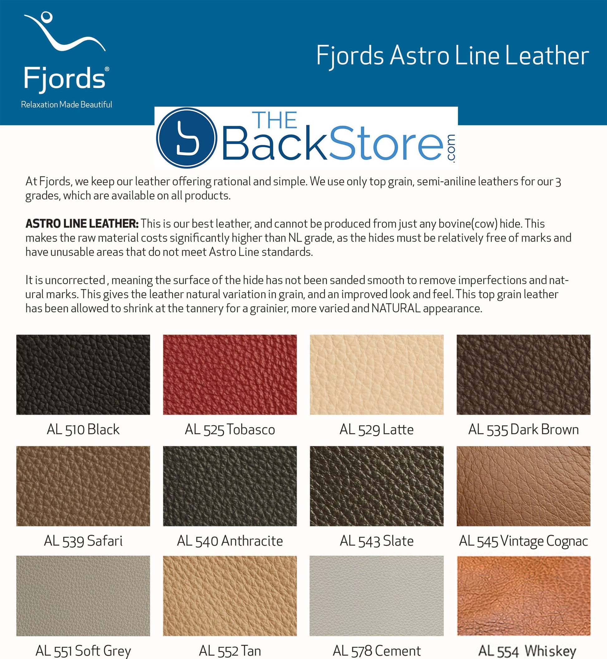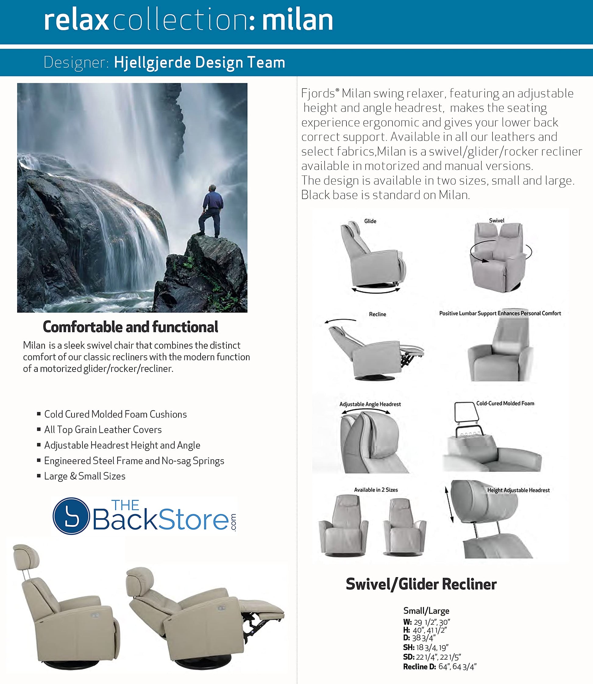 Details: Fjords Milan Small Power Recline Swivel Swing Relaxer Recliner Chair in Astro Line Leather. Fjords relaxers have unique comfortable properties in all positions. Continuous back adjustment, combined with an integrated footrest and a comfortable rocking function make this a very practical and comfortable choice. Easy to Control Power Recline. It is supplied with 170 degree swivel rotation. Genuine Fjords Leather Recliners feature the Fjords Active Release System. It is a unique integrated mechanism providing the best support for the neck. When desired, it can be adjusted with a single movement to optimize your sitting experience. It is an ergonomically designed chair that provides continuous support and comfort. It helps to prevent your legs and back from getting tired, relax your body and enable your blood to circulate more freely. It is designed to support your spine more correctly comfortably in the correct angle. Fjords utilizes cold cure molded foam in the seat, back, armrest and footrest. Cast molded cold cure foam retains its suppleness longer than standard block molded foam in order to retain its durability and physical appearance. The unique gliding mountings that are built in to the chairs provide he best individual resting position. All electrical components are UL and CE listed. Fjords Factory One Year Parts Warranty. DIstance from Wall to Recline is 8.5' Extended 5 Year In-Home Parts and Labor Warranties are also available on ASIN - B073ZPXCLH All warranties are to the original purchaser and not for rental or commercial use. Approximate Dimensions: LARGE CHAIR: 41.5' H x 30' W x 38.7' D Seat Depth - 22.3' 145 lbs Seat Height: 19' SMALL CHAIR: 40' H x 29.5' W x 38.7' D Seat Depth - 22.3' 145 lbs Seat Height: 18.7'