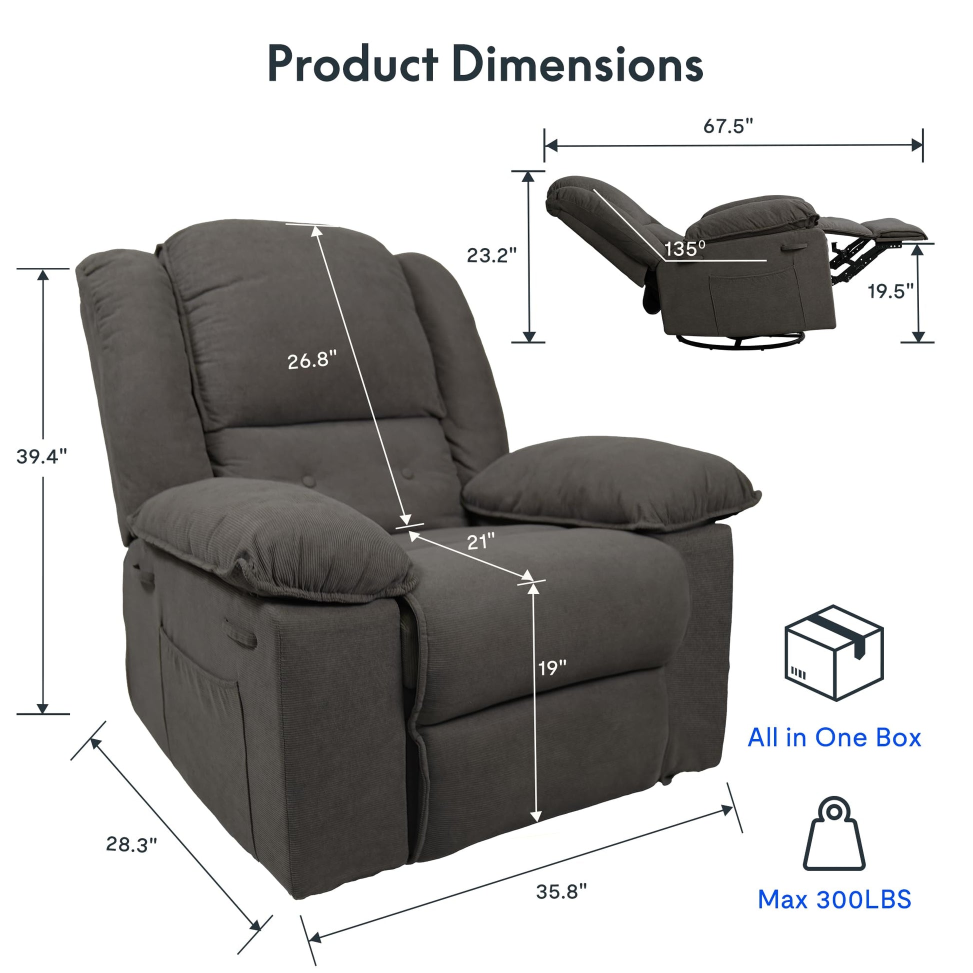 - 【Swivel and Rocking Motion】- This rocking recliner boasts a 270° swivel feature, allowing you to easily rotate for conversations or adjust your seating position. Its 30° rocking function offers a soothing way to unwind, and the side handle lets you recline up to 135° for maximum comfort.