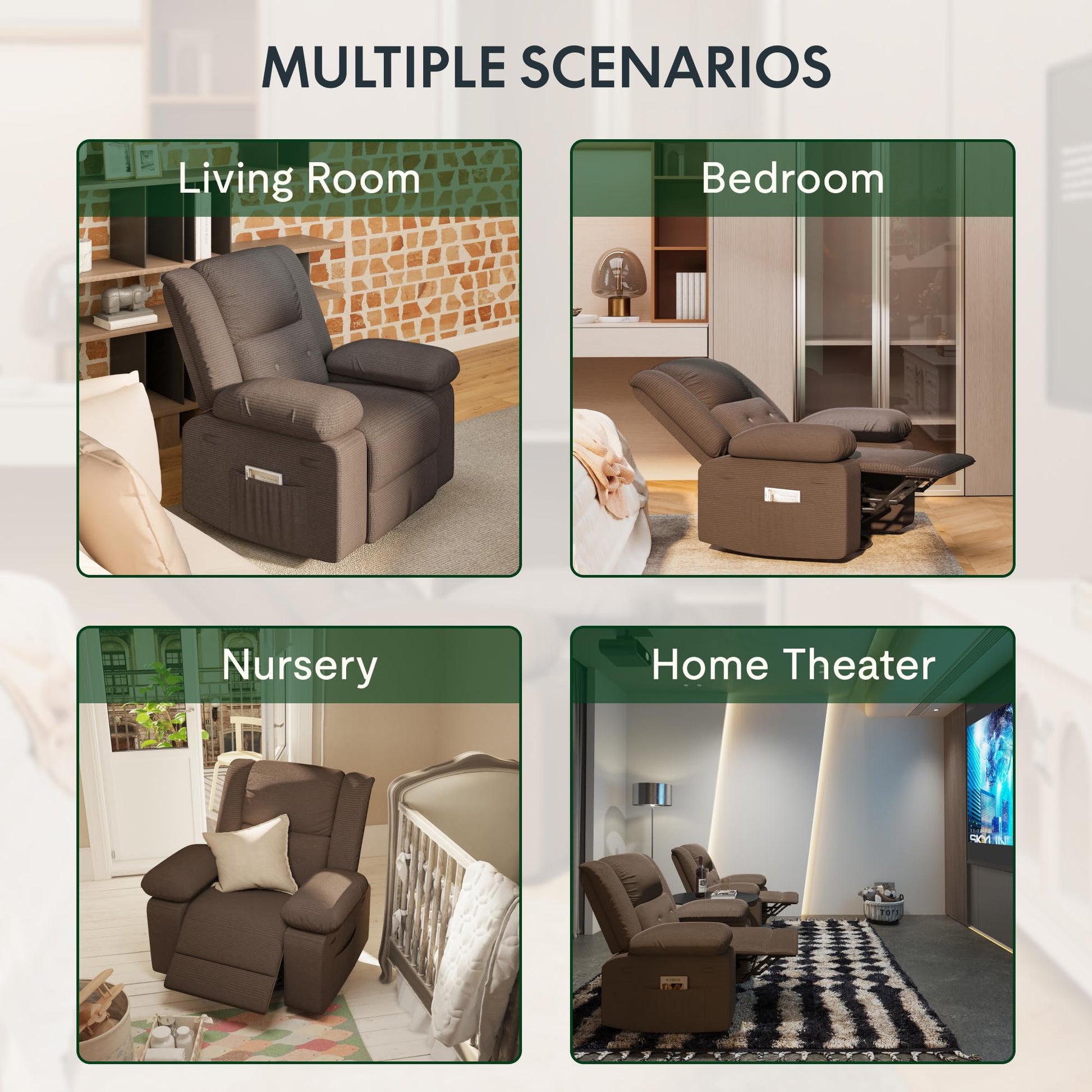 - 【Rocking Chair for Any Space】— This small recliner for small spaces, measuring 39.4'H x 35.8'W x 28.3'D, adapts seamlessly to any setting — from a large and spacious living room and a cozy den to a nursery, or RV on the go. This swivel nursery glider recliner provides unparalleled comfort and fits perfectly to any environment.