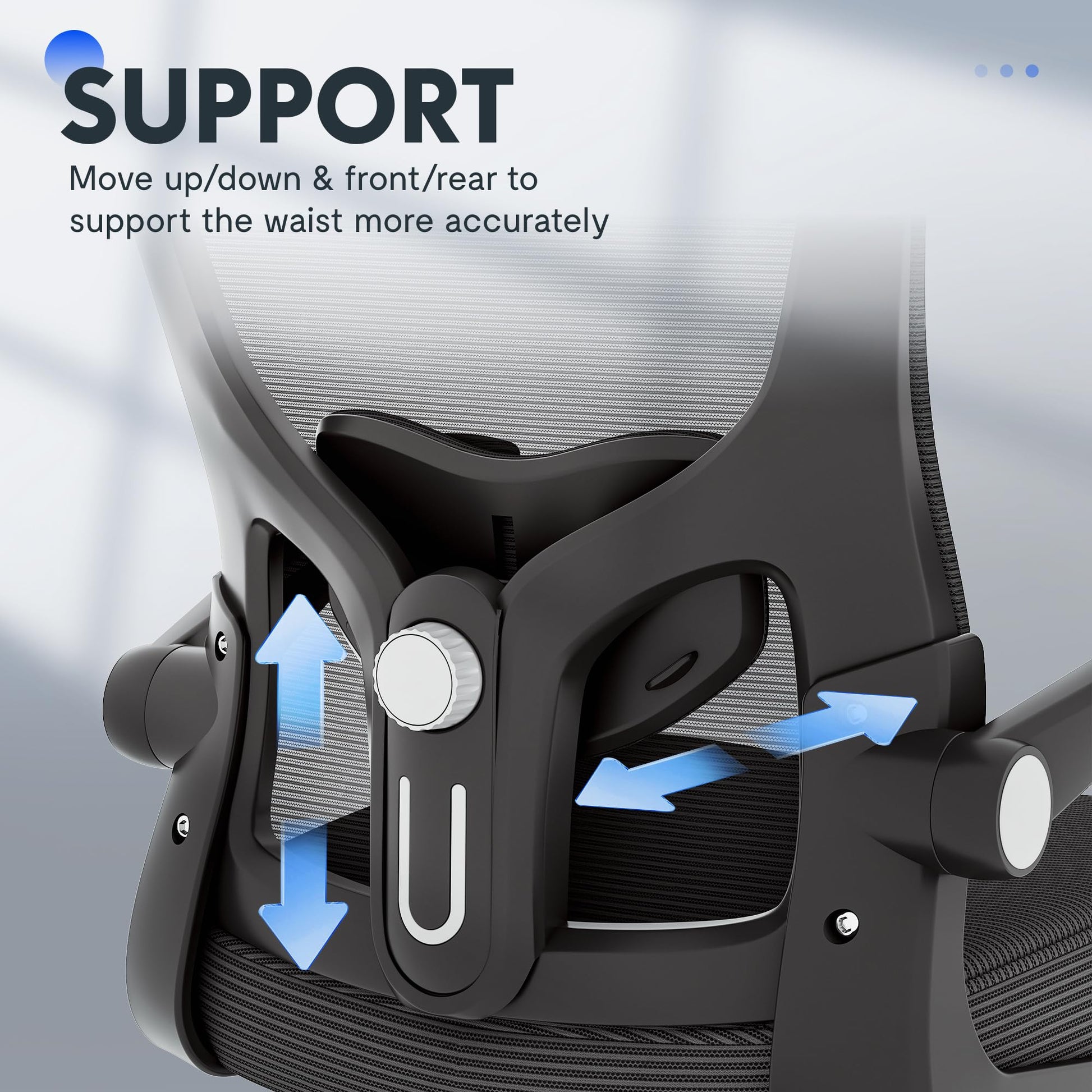 - Ergonomic Office Chair: This chair’s ergonomic design includes a 2D lumbar support for customizable lower back comfort, 3D flip-up armrests that can be adjusted or moved out of the way, and an adjustable footrest ring to support different seating positions. Additionally, the flip-up armrests allow the chair to slide easily under the desk, saving space when not in use. These features ensure a comfortable and healthy posture, perfect for long hours of work