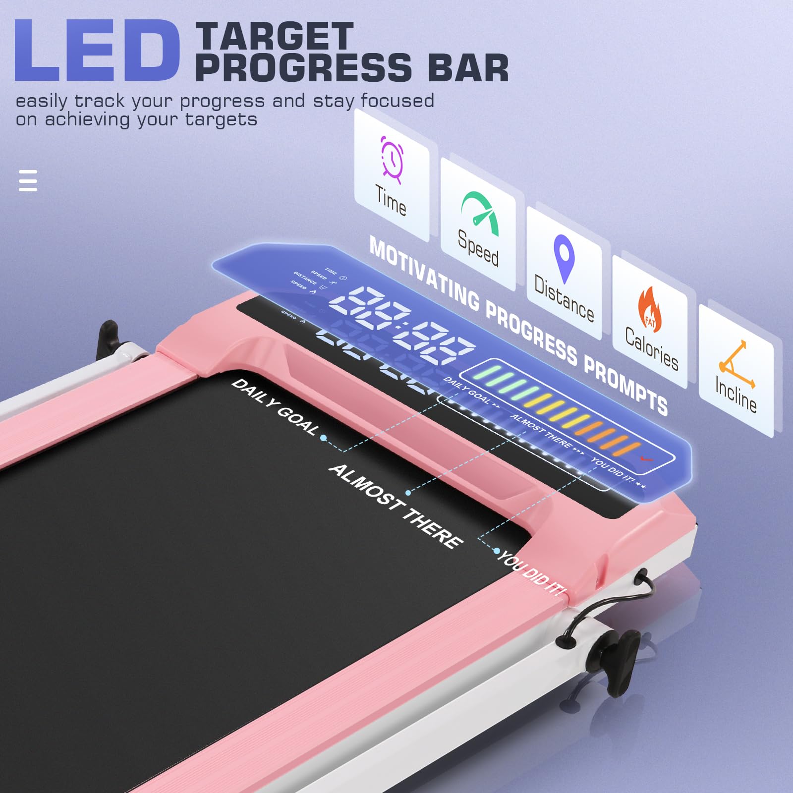 - ✦【Smart Treadmill with LED Display】Features a large LED display monitoring key workout metrics including time, calories burned, speed, and distance in real-time. The innovative progress bar and three-stage smart reminder system help you easily set goals and stay motivated, maintaining complete control over your fitness routine. This portable treadmill includes 12 built-in workout programs to accommodate various fitness levels and goals