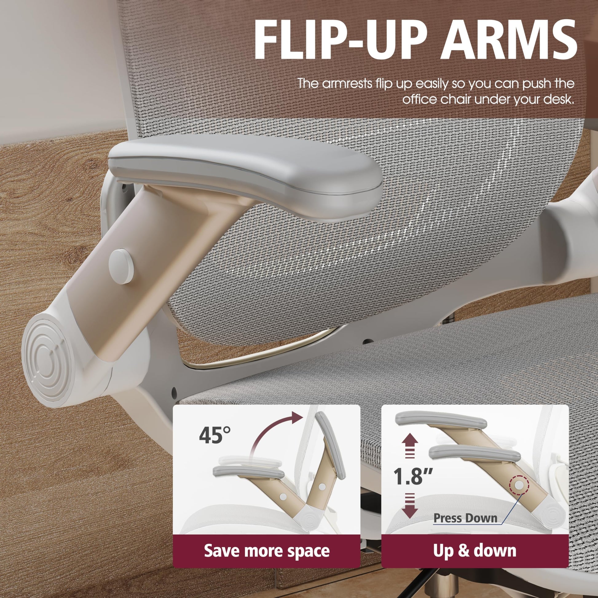 GABRYLLY Ergonomic Office Chair, High Back Home Desk Chair with Headrest, Flip-Up Arms, 90-120° Tilt Lock and Wide Cushion, Big and Tall Mesh Chairs for Man Woman, White Task Chair