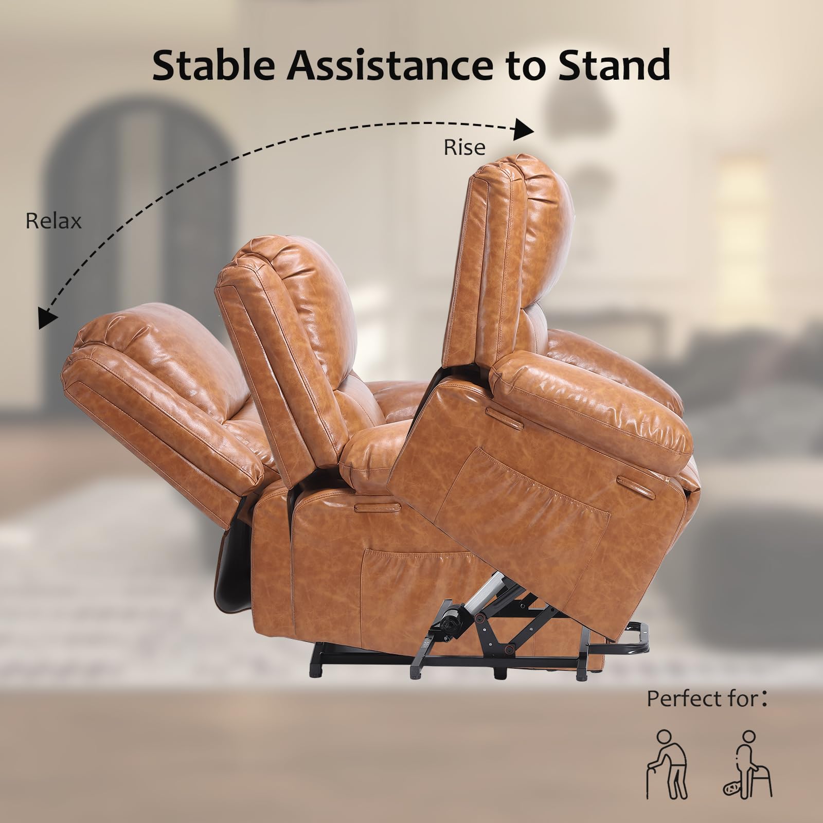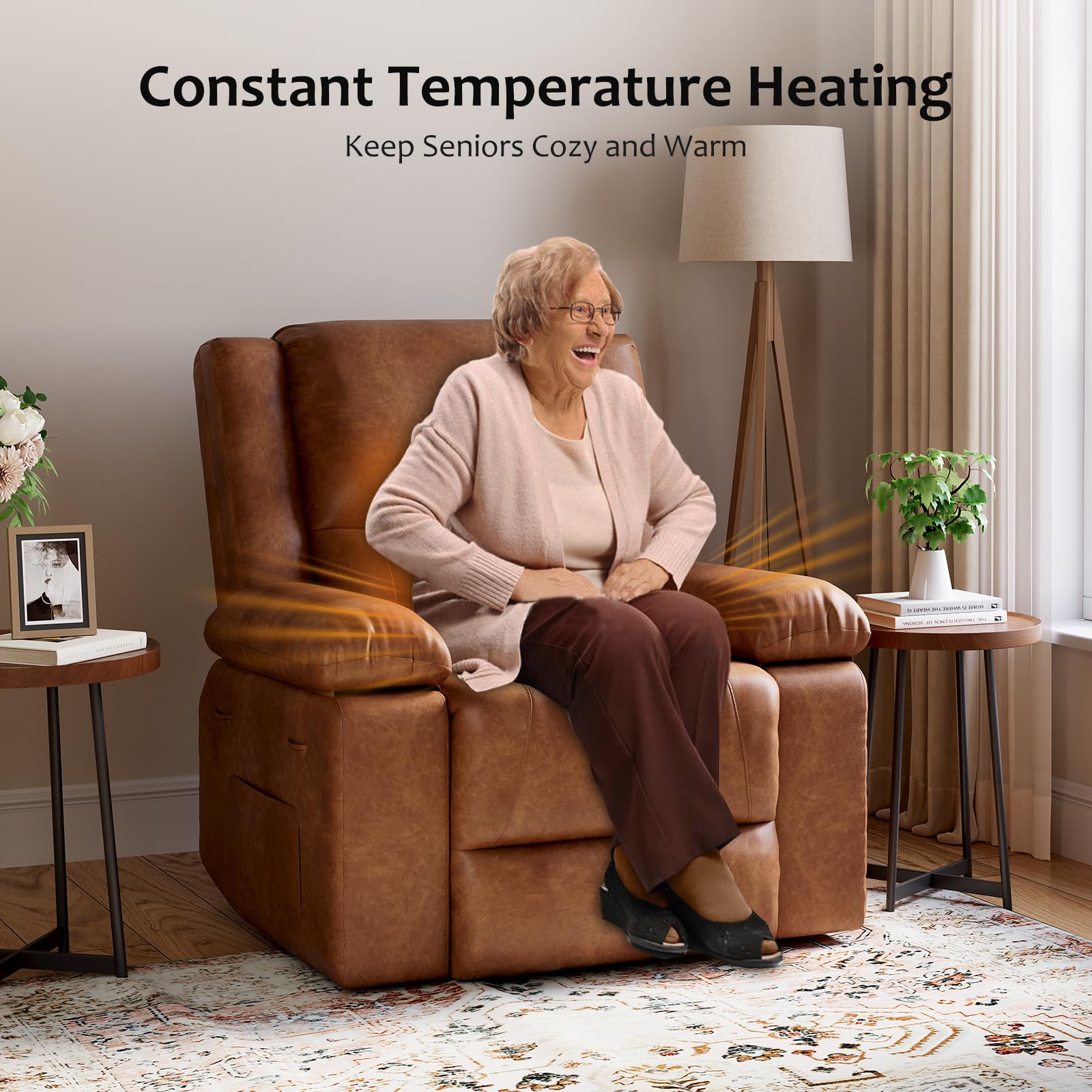 GarveeHome Faux Leather Power Lift Recliner w/Massage and Heat for Elderly, Recliner Chairs with Pockets for Living Room (Cognac, Medium)