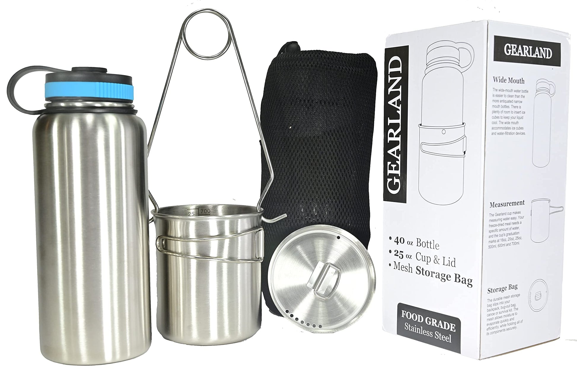 - SAFE: Food Grade stainless steel canteen water bottle keeps water fresh. Bottle and camping cup are not coated so there is no chance of other flavors. The stainless steel campfire cooking equipment can be inserted directly into the fire to warm your food. Do not expose the plastic lid to heat. The cup and lid can be used as an ultimate ultra-lite camping cookware set. Leave your other camp cookware or camping mess kit behind when you use this set from Gearland.