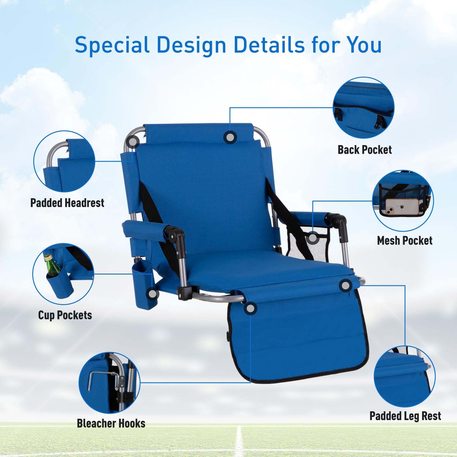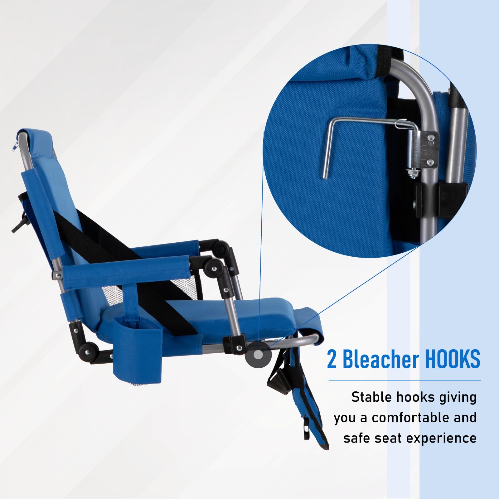 • 【Comfy Seat】The cushioned seat and backrest ensure comfort on bleachers, benches, or flat ground. Additionally, two concealed hooks on both sides provide extra stability. The armrest allows you to take a short break. A Great comfortable seat for bottom and back support.