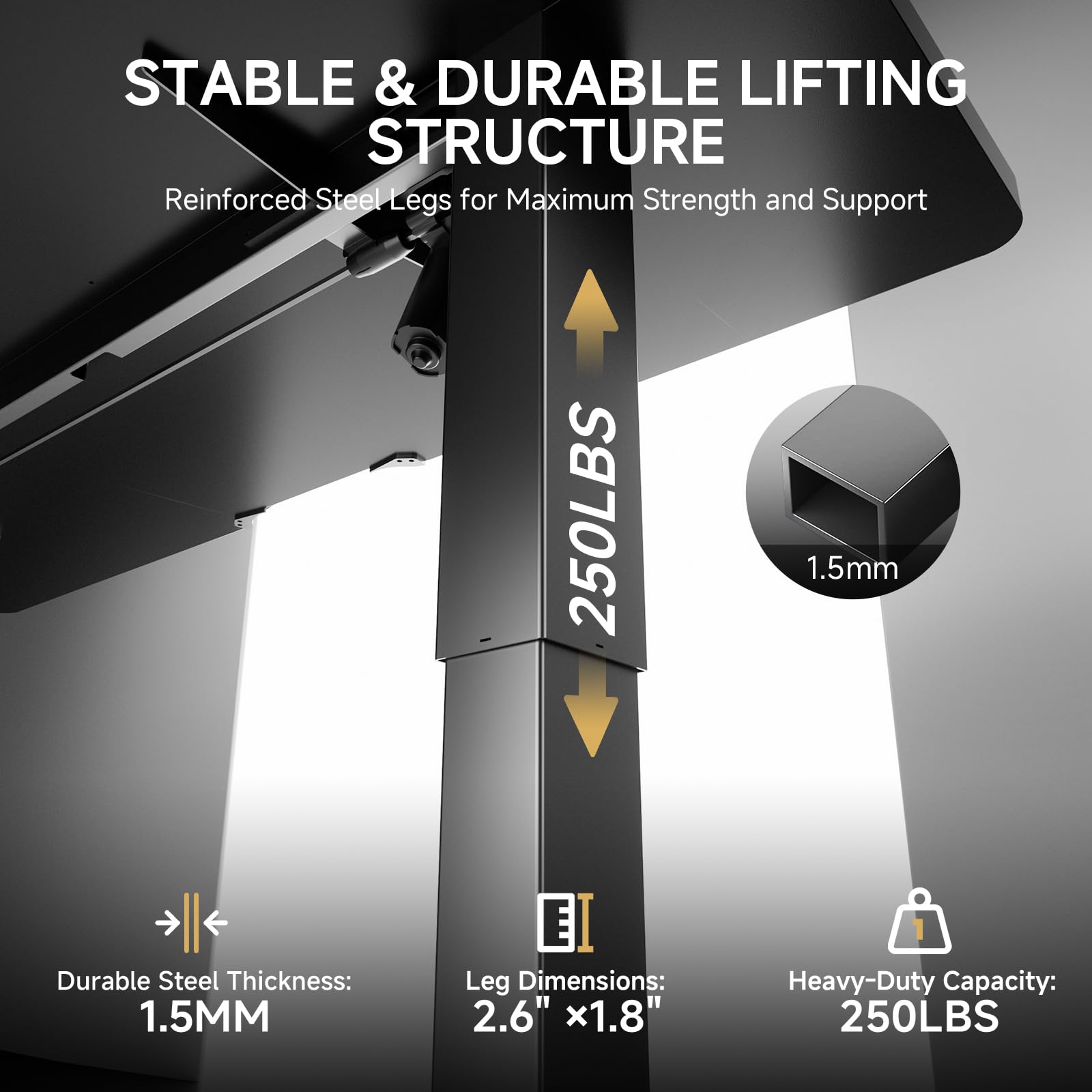 - ROCK-SOLID STABILITY: Built with a 1.5mm commercial-grade steel frame and reinforced connection area, this adjustable standing desk supports up to 250 lbs, making it ideal for heavy equipment and multiple monitors. The wide T-shaped legs and adjustable feet provide excellent stability, keeping the desk steady and secure, even at its highest position.