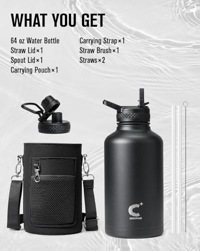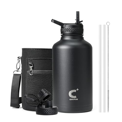 Half Gallon Water Bottle Insulated, Coolplus 64 oz Stainless Steel Water Jug With Straw Metal Double-Walled Vacuum Large Flask With Carry Sleeve Leakproof, Keep Cold 48 Hrs Hot 24hrs, Black
