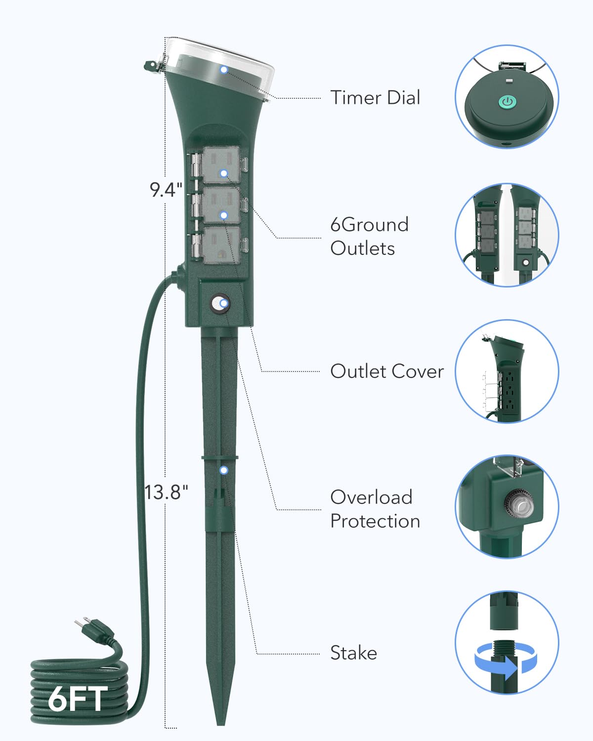 - 【Versatile & Safe Outdoor Power Solution】Our yard stake timer, doubling as an outdoor outlet timer, features 6 grounded outlets with a 6ft cord, allowing simultaneous power for multiple devices. Equipped with IP44 waterproofing and built-in overload protection, this outdoor power stake timer ensures safe and extensive coverage for all your outdoor electrical needs.