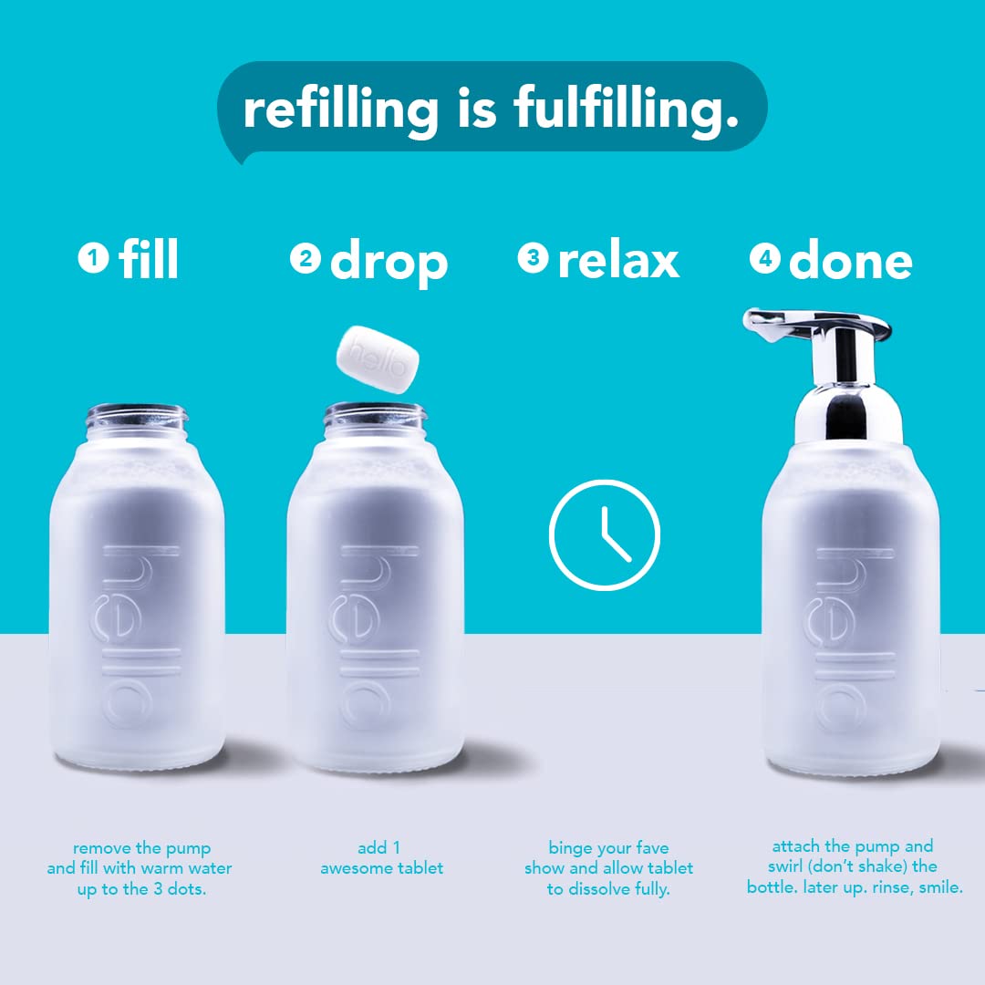 - FILL, DROP, FOAM: Hello Hand Soap Tablets are a convenient and easy way to refill your foaming hand soap - just fill the pump with water, drop in a tablet and let is fizz