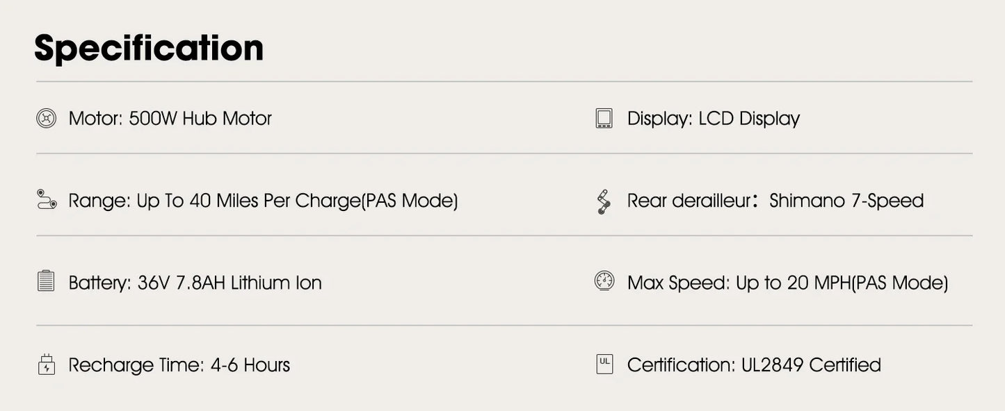 Experience effortless riding with the HILAND Electric Bike for Adults. A 500W 36V motor combined with 7 speeds allows for a top speed of 20MPH, making it perfect for commuting or leisurely rides. The removable battery ensures convenience and the 26-inch wheels provide a smooth ride on any terrain.