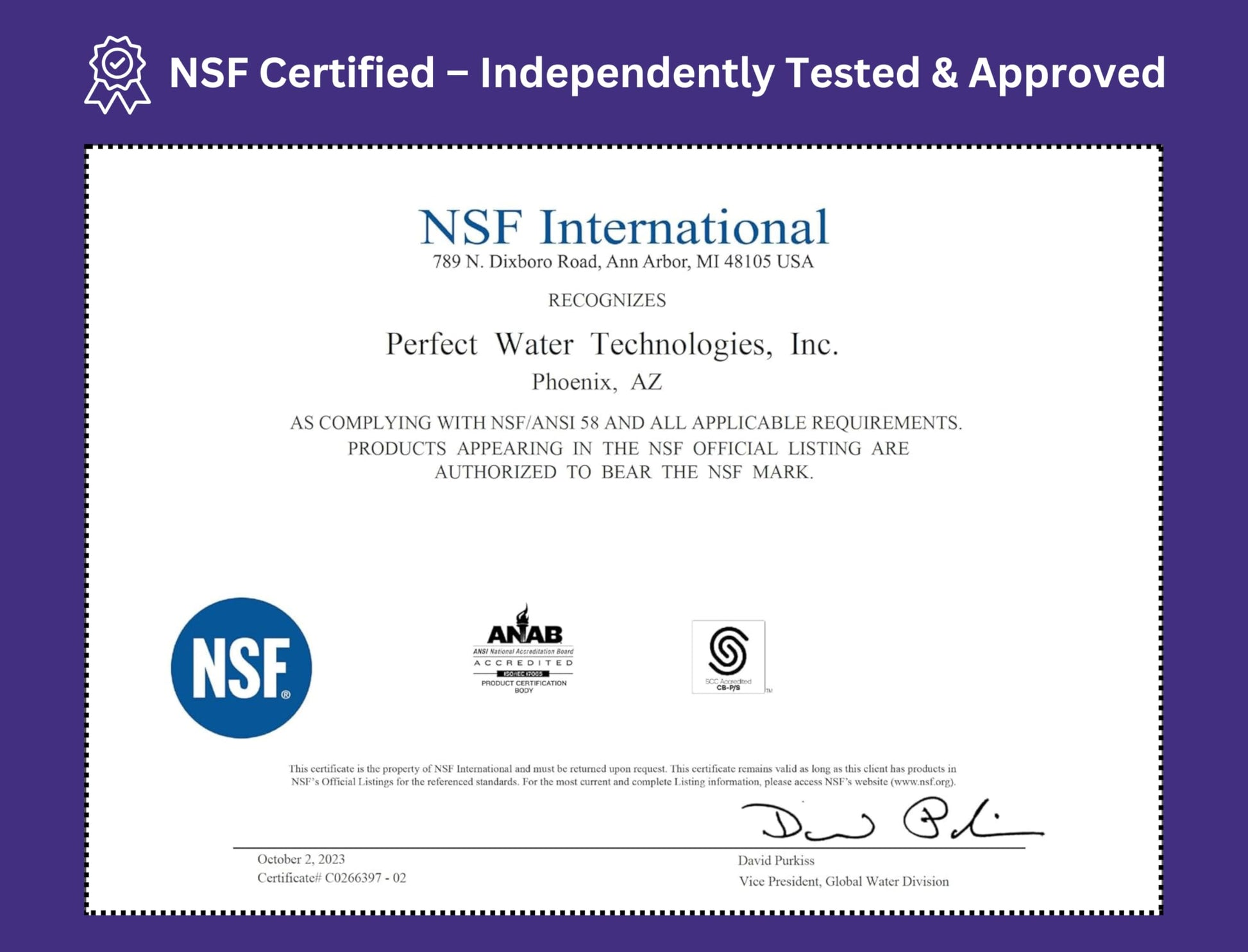 - NSF Certified Quality: All components are certified by NSF for material safety and performance, affirming that our system meets stringent standards. Proudly Made in the USA by an NSF listed company.